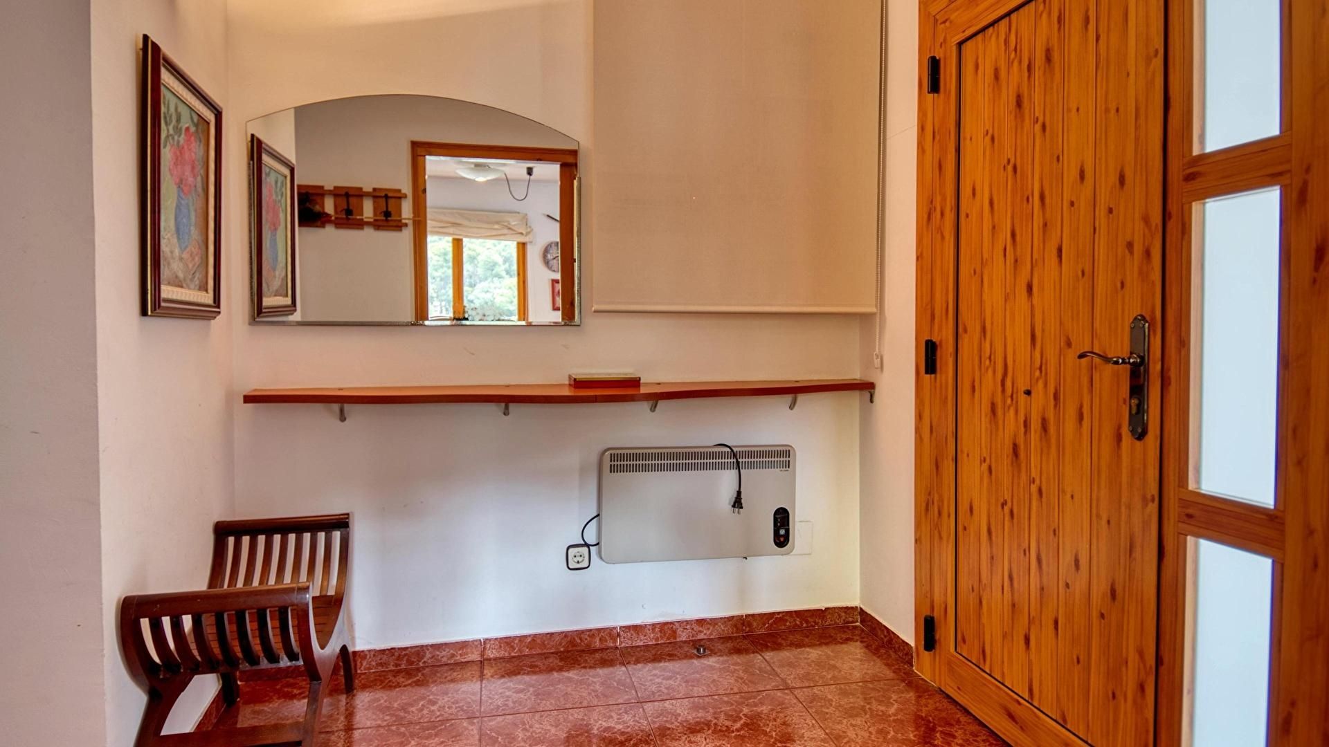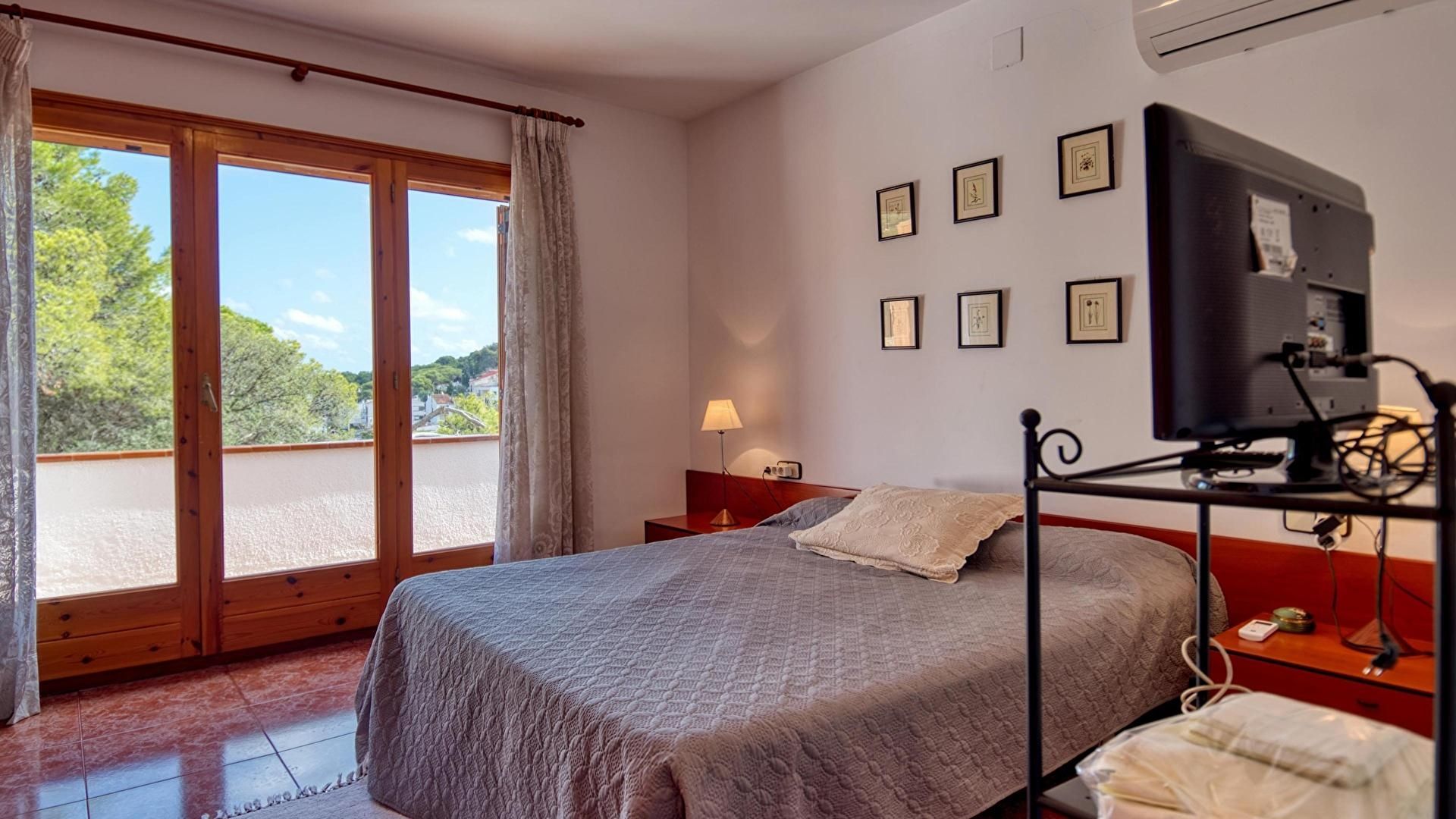 Etage 2- Schlafzimmer mit 1 doppelbett, ausgang zum balkon, fernseher und kalte und heisse klimaanlage.