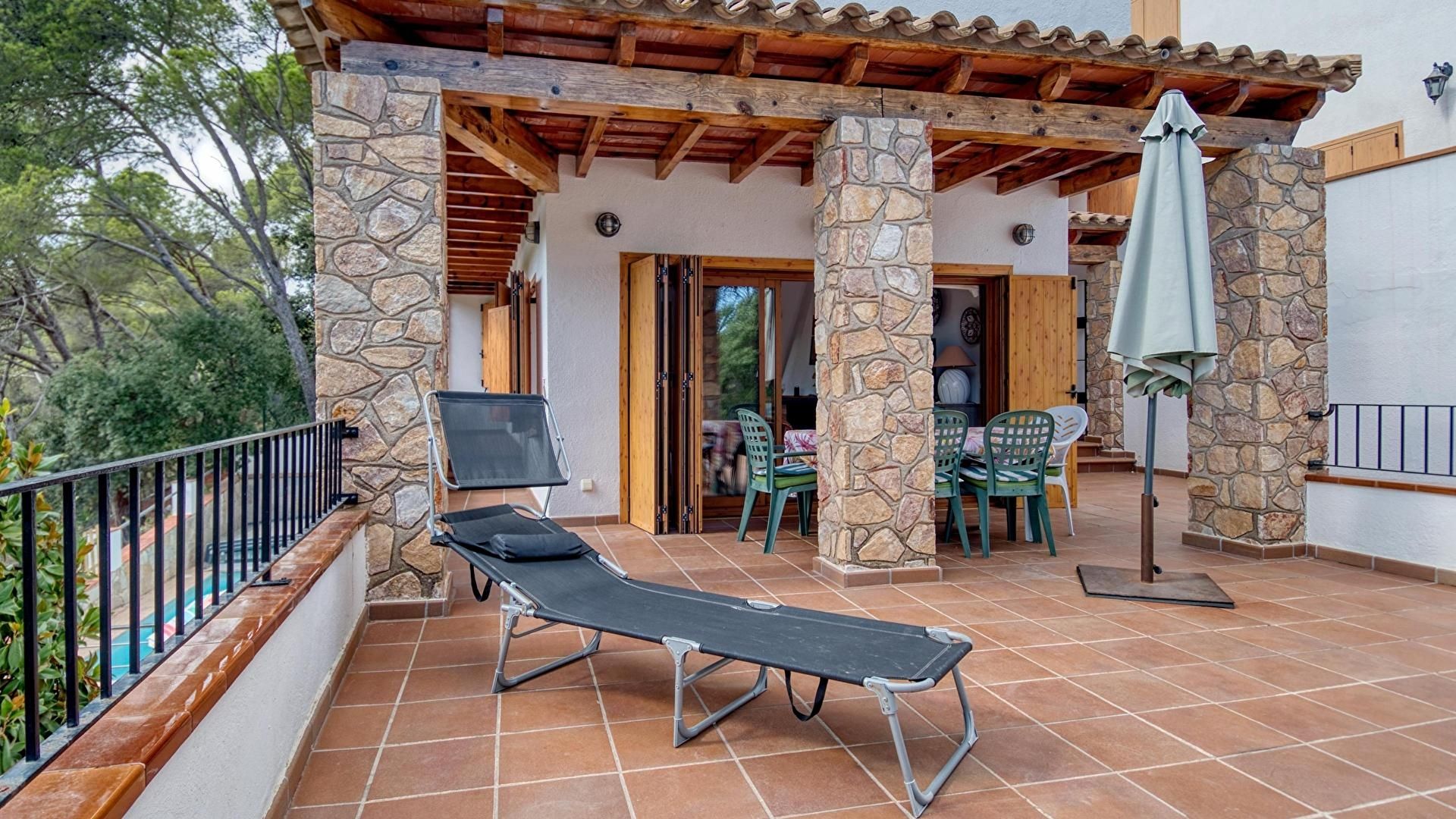 Garten mit Pool, Terrasse, Wohnzimmer-Esszimmer, Küche, 4 Schlafzimmer, Balkon, 1 Bad mit Badewanne, 1 Bad mit Dusche und Garage.