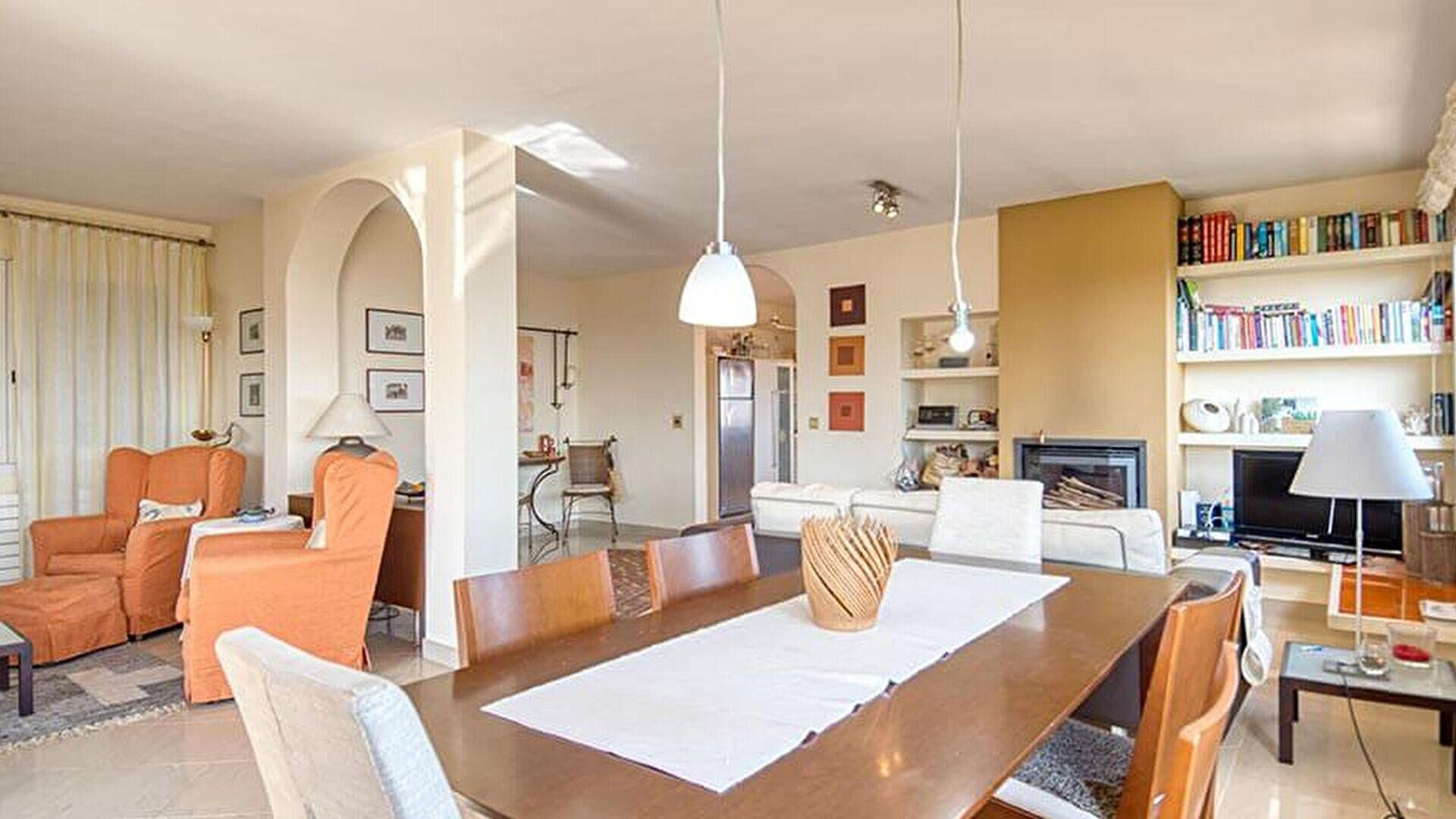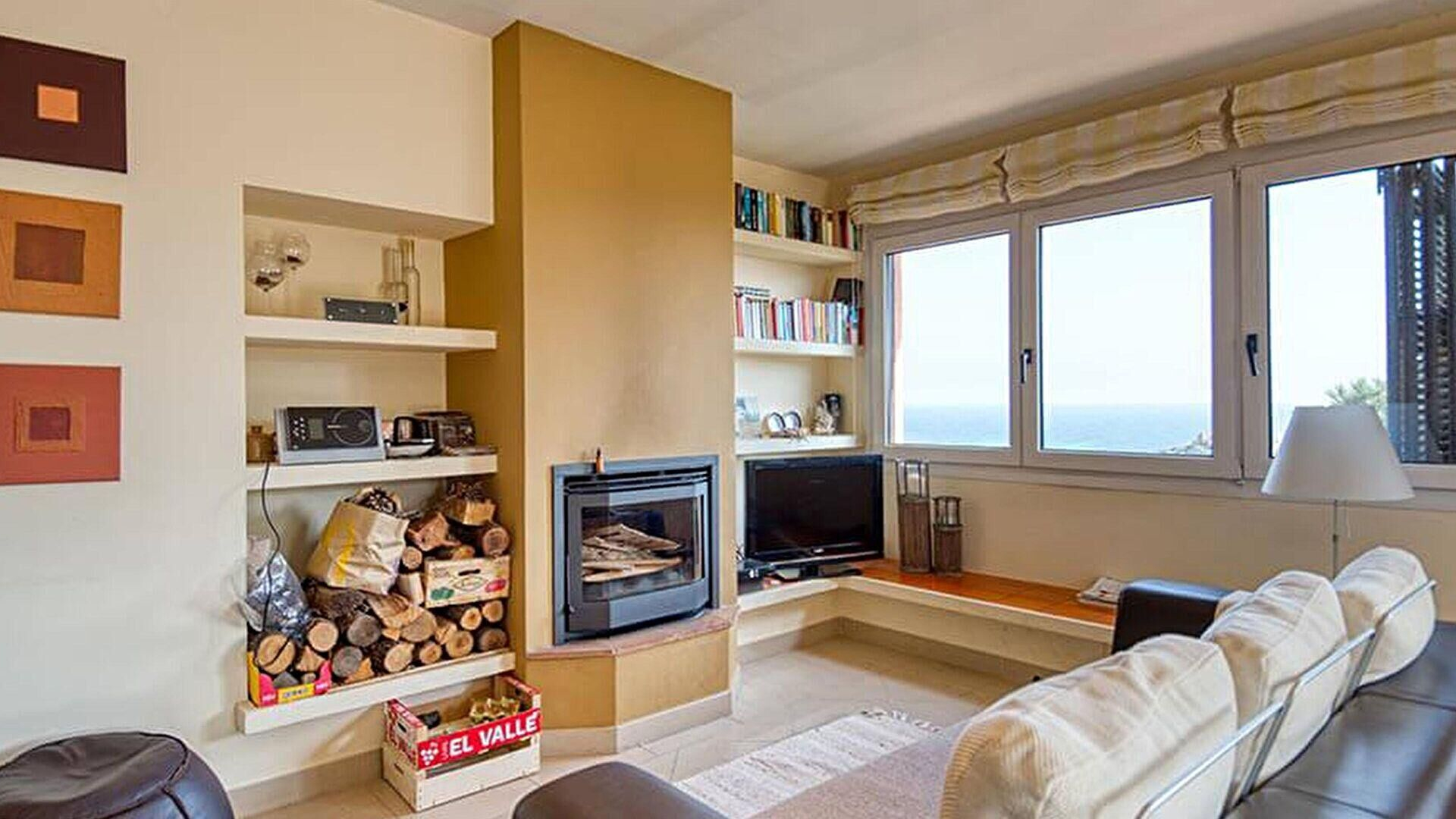 - Wohnzimmer-esszimmer mit fernseher, kamin, ausgang zur terrasse und meerblick.