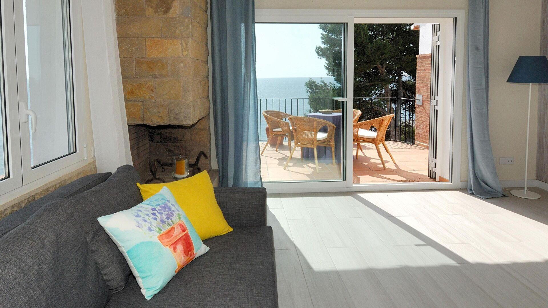 • Wohnzimmer-esszimmer, kamin, kalte und heisse klimaanlage, meerblick und ausgang zur terrasse.