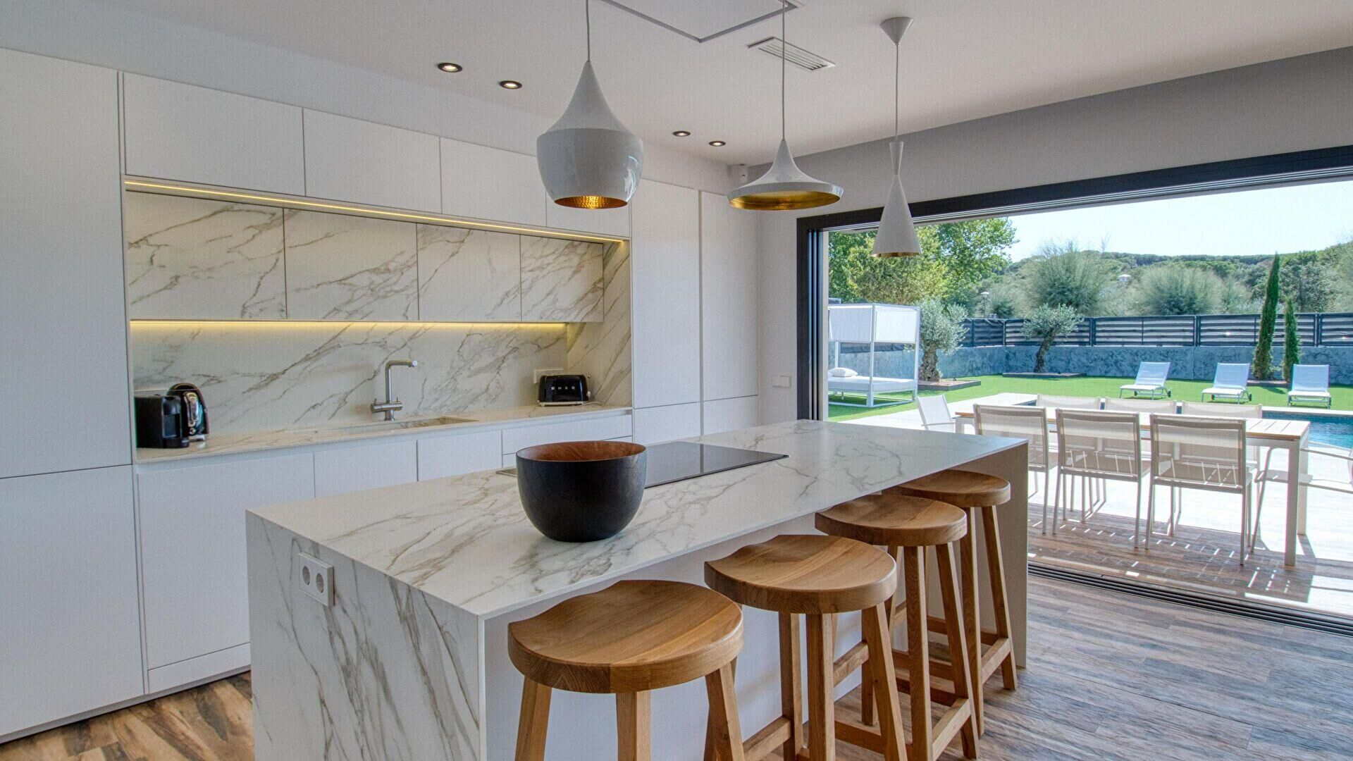 Garten mit Pool, Veranda, Wohnzimmer-Esszimmer, offene Küche, 7 Schlafzimmer und 5 Bäder mit Dusche.