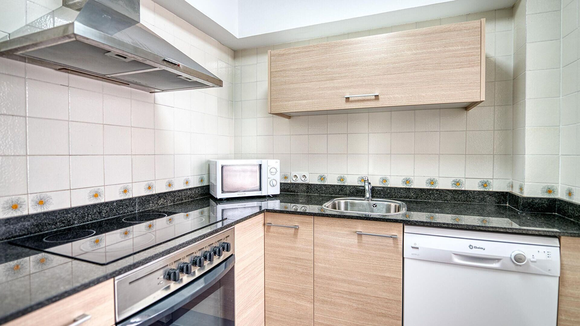 • Küche mit glaskeramik-kochfeld, ofen, mikrowelle, kühlschrank, spülmaschine und waschmaschine.