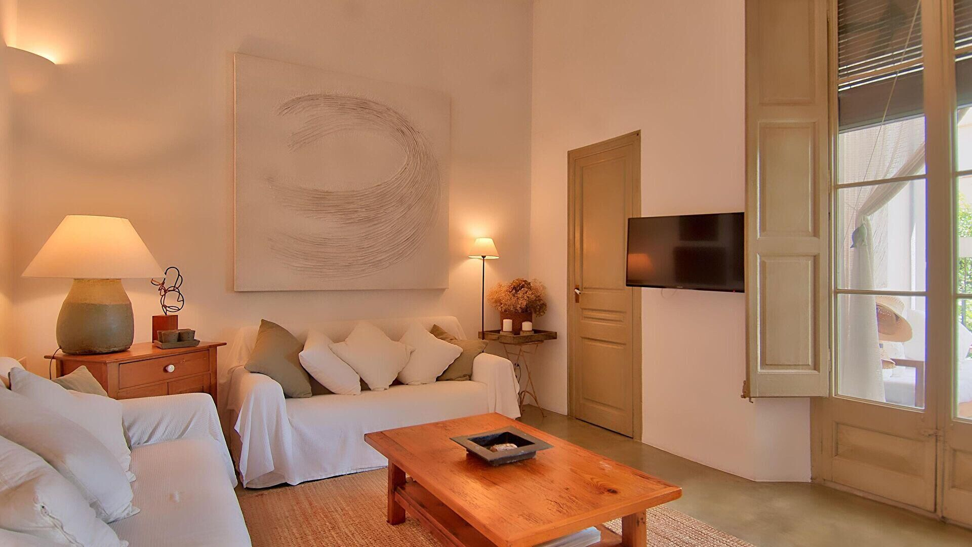 • Wohnzimmer-esszimmer mit ausgang zur veranda und fernseher.