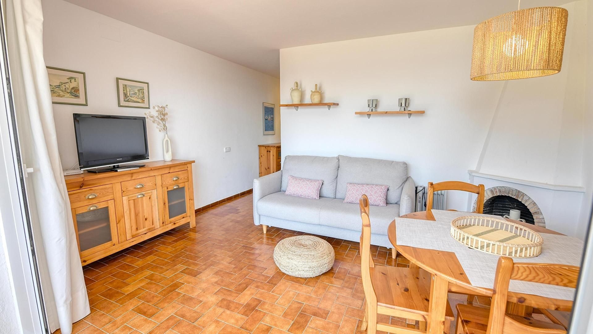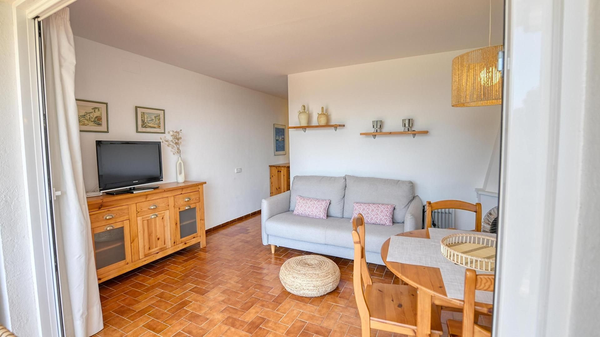 - Wohnzimmer-esszimmer mit 1 doppelschlafsofa, fernseher und ausgang zur terrasse.