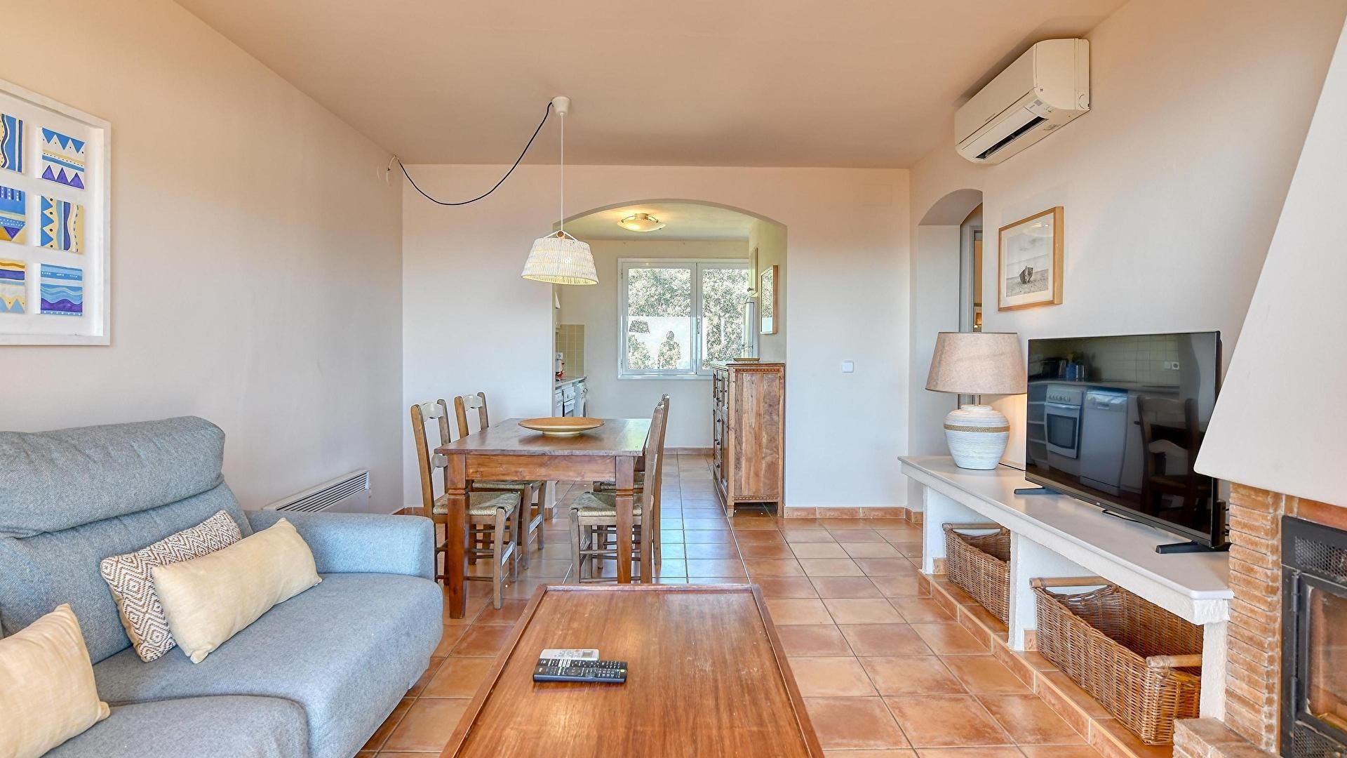 - Wohnzimmer-esszimmer mit 1 doppelschlafsofa, kamin, fernseher, kalte und heisse klimaanlage mit unabhängigem thermostat und ausgang zur terrasse.