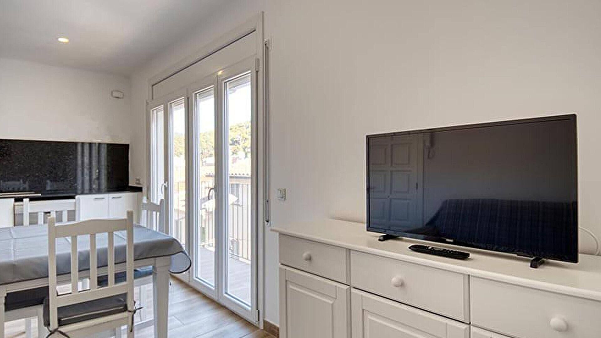 - Wohnzimmer-esszimmer mit fernseher, kalte und heisse klimaanlage und ausgang zum balkon.