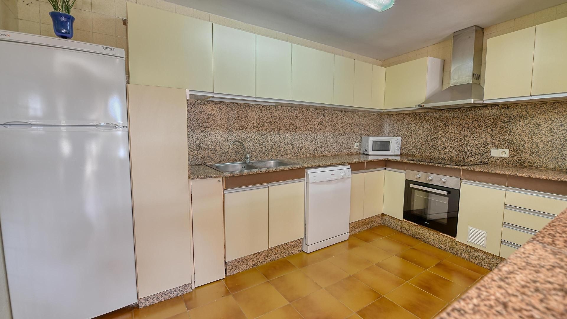 - Cuisine américaine avec four, micro-ondes, réfrigérateur, lave-vaisselle, machine à laver et plaque de cuisson vitrocéramique.