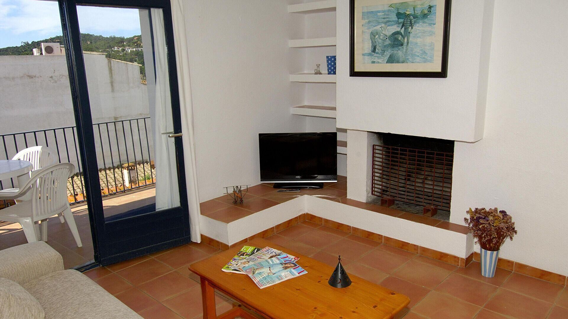 - Comedor-estar, chimenea, televisor y salida a la terraza.