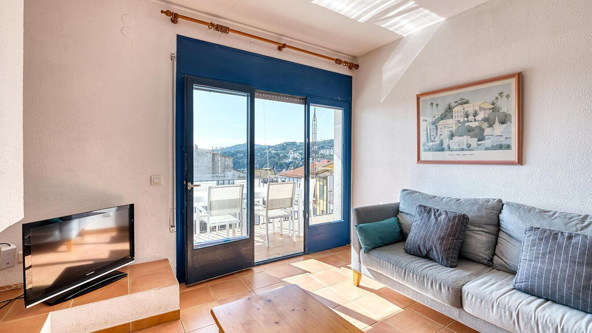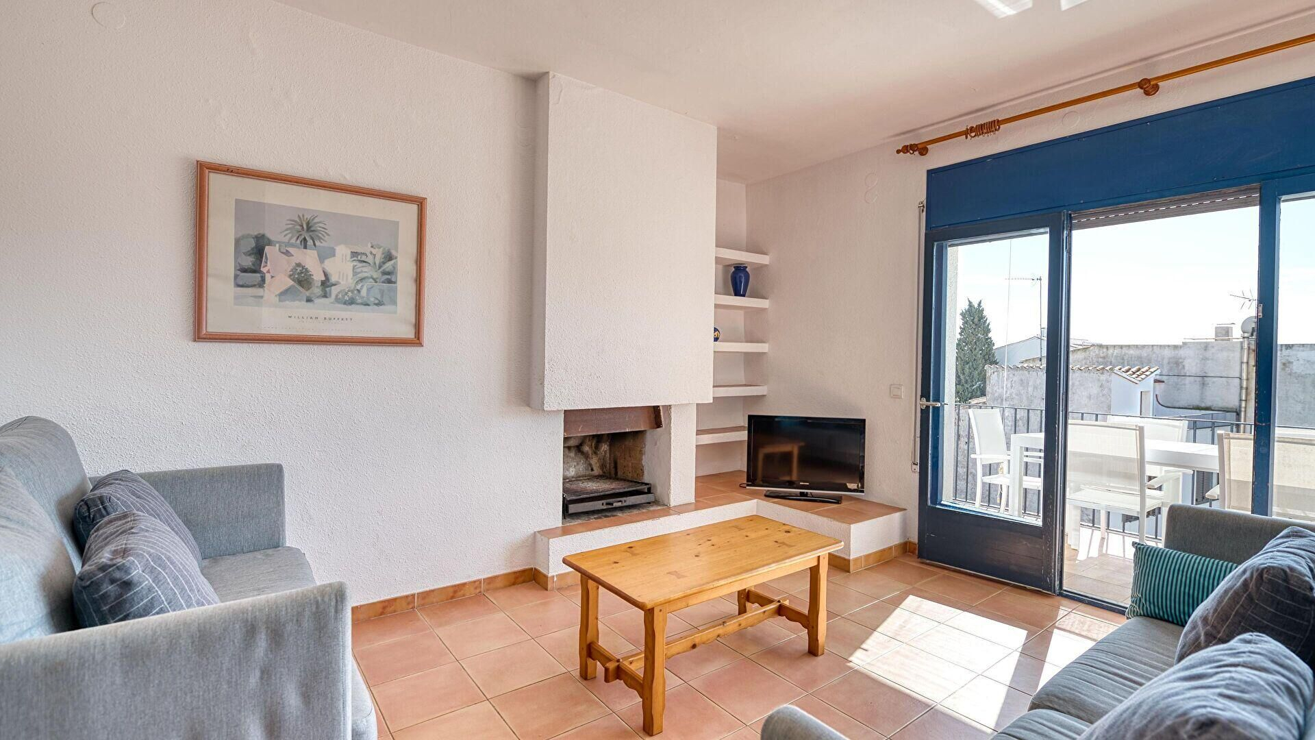 - Comedor-estar, chimenea, televisor y salida a la terraza.