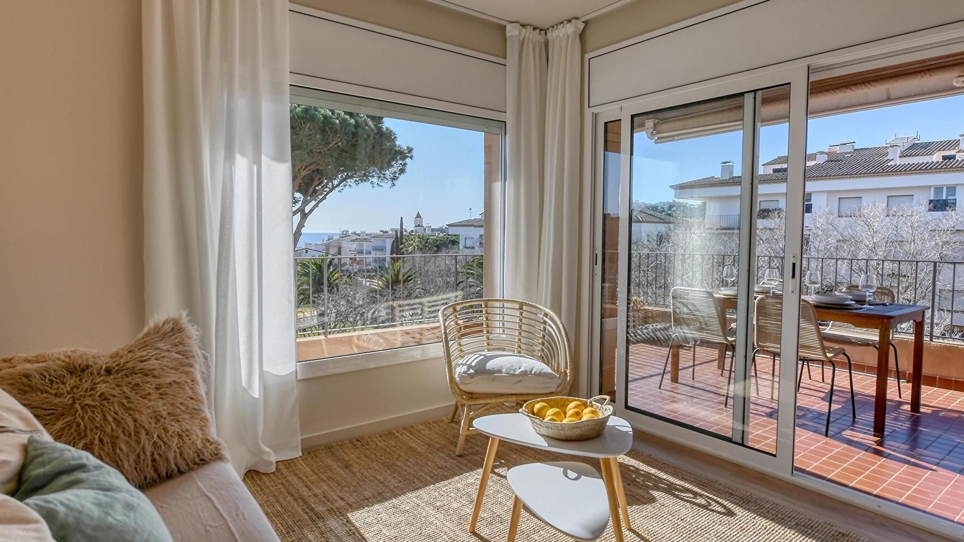- Sala de estar con televisor, salida a la terraza y vistas al mar.