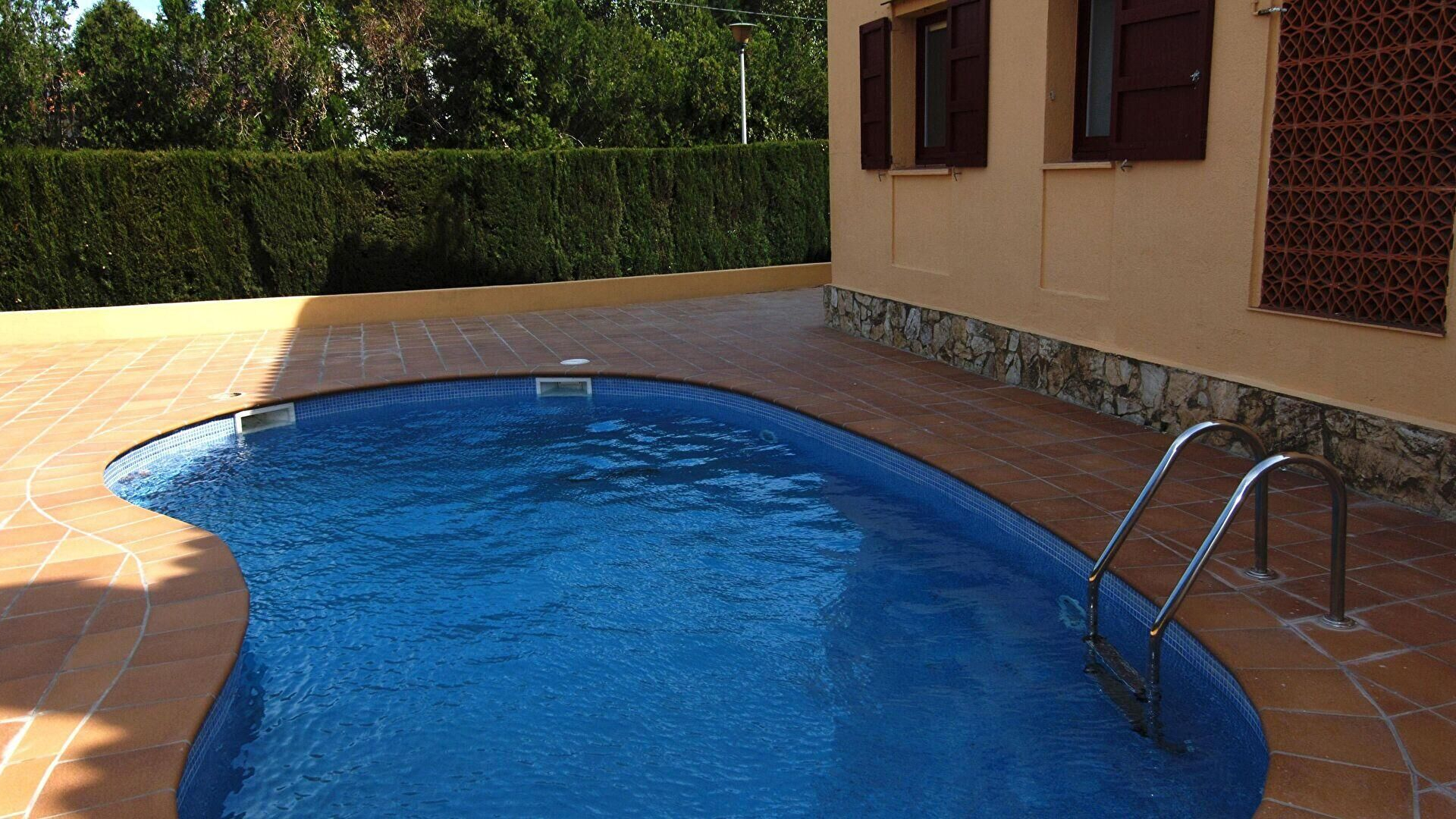 Piscina comunitaria y muebles de terraza.