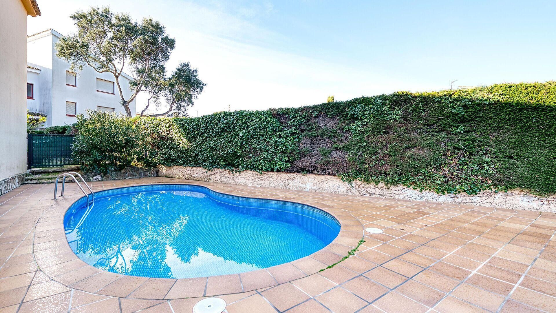 Piscina comunitaria y muebles de terraza.