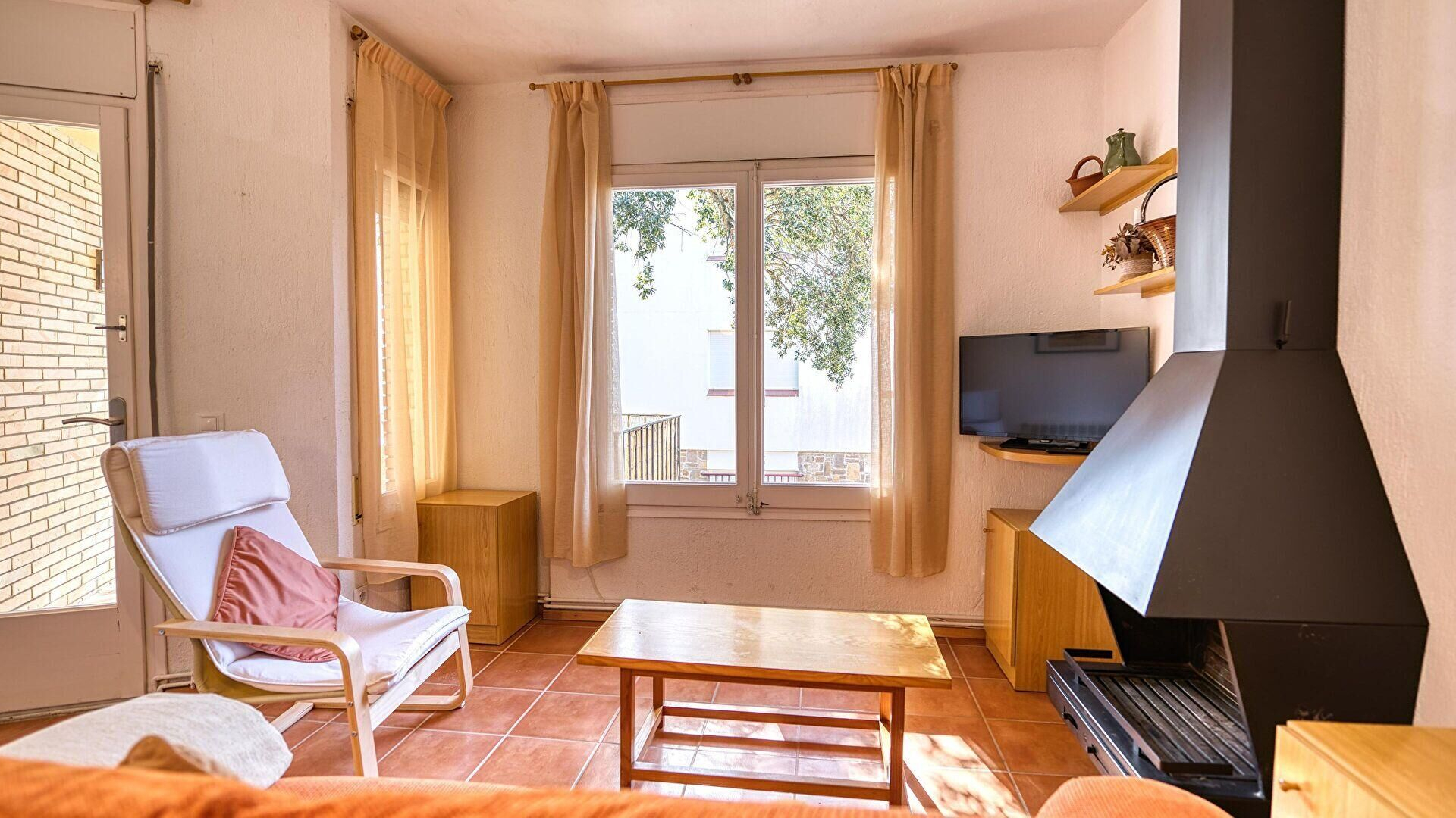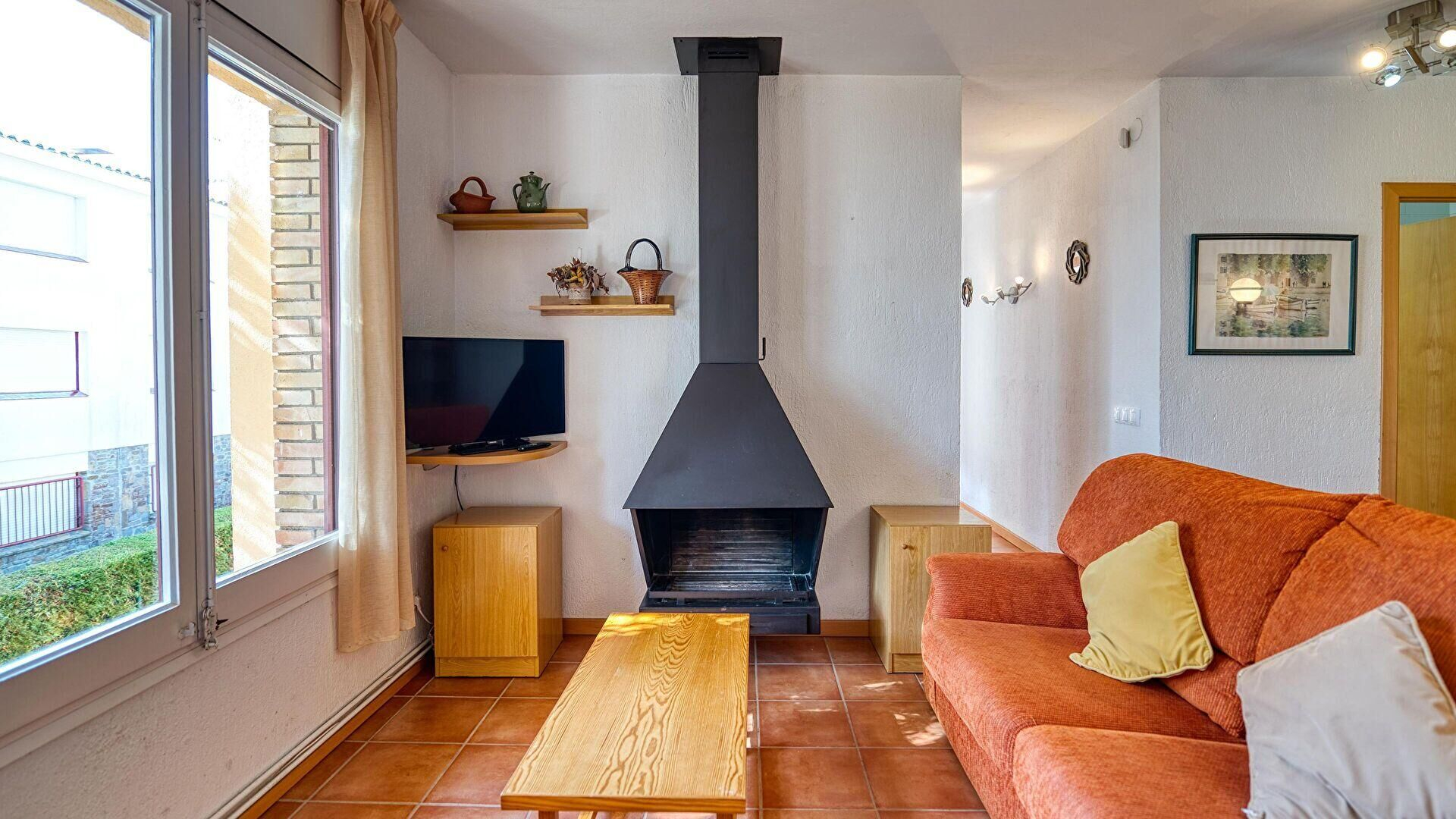 - Comedor-estar, televisor, chimenea y salida a la terraza.