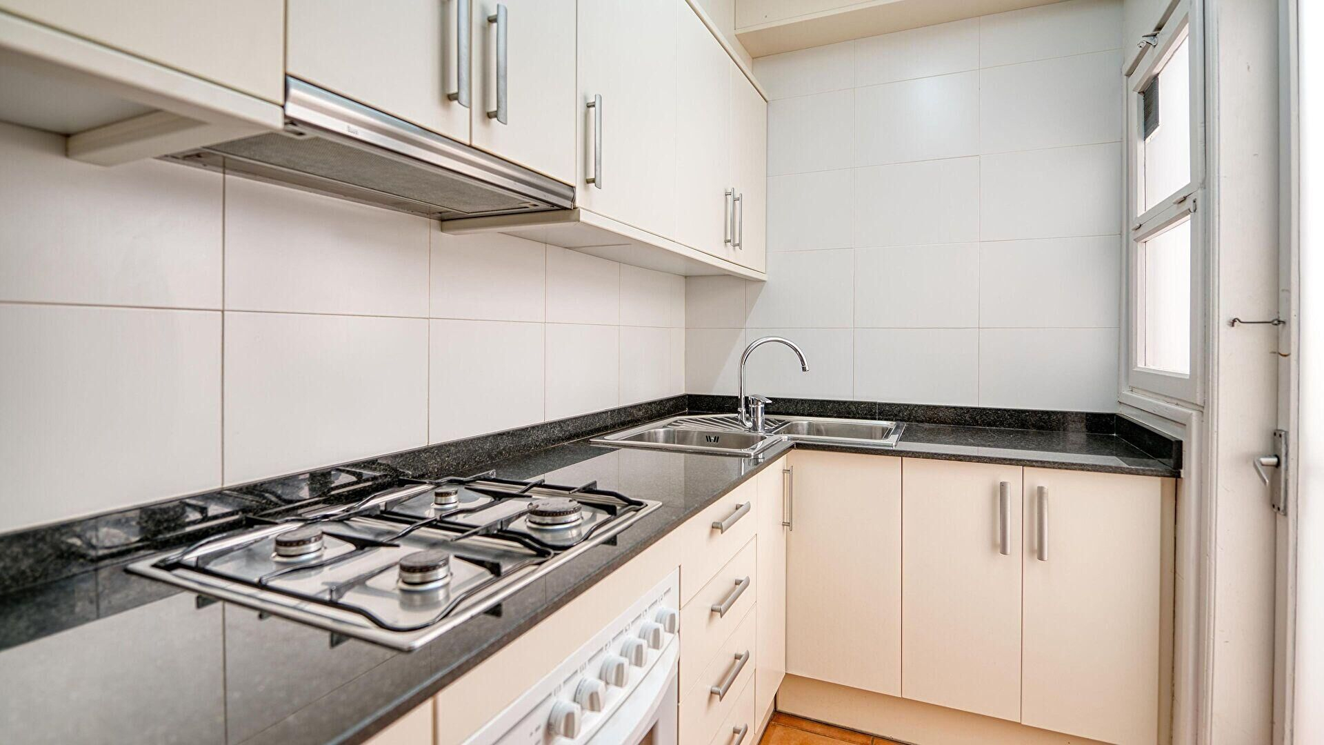 - Cocina con horno, nevera, lavadora y encimera a gas.