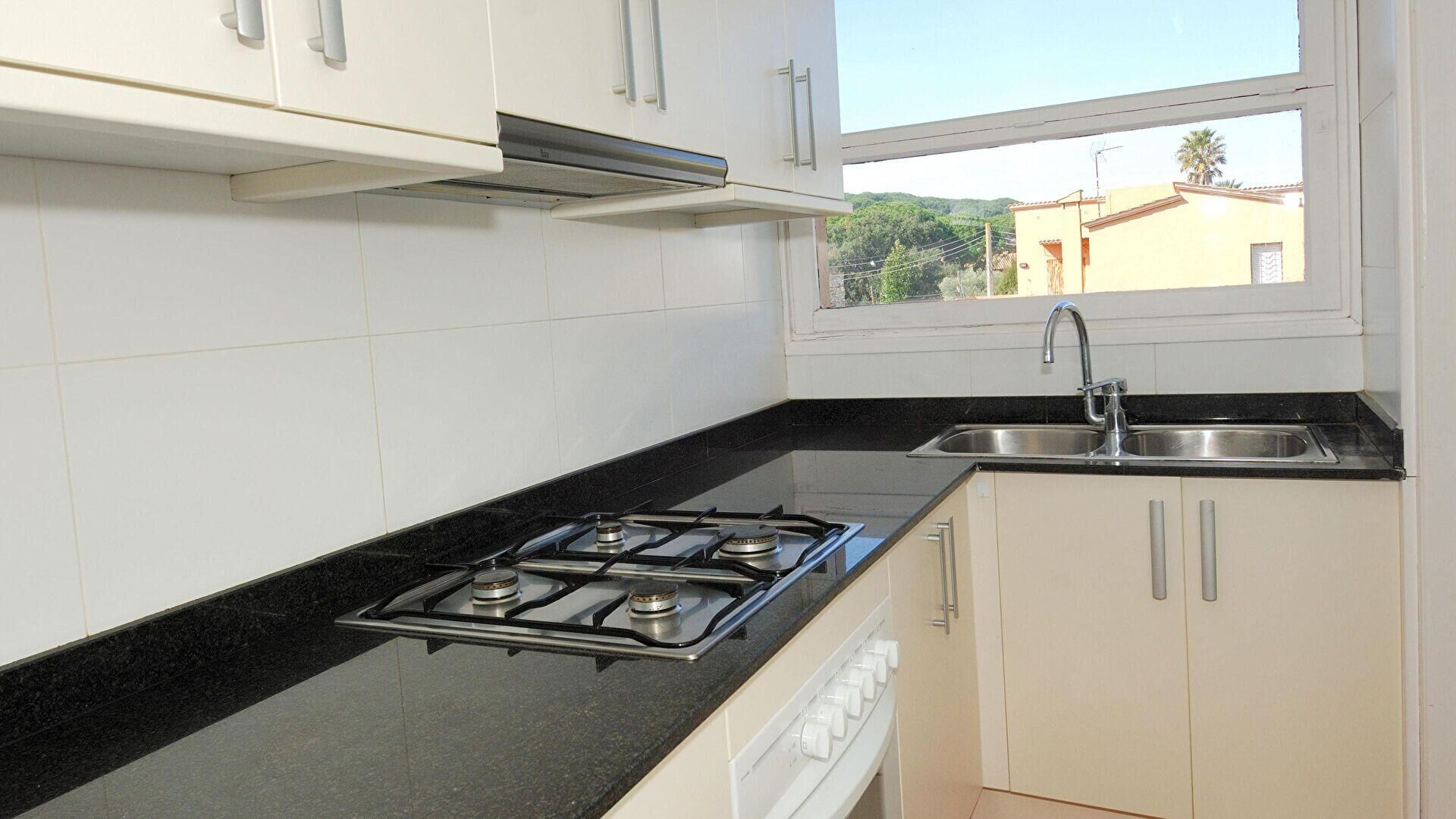 - Cocina con horno, nevera, lavadora, encimera a gas y lavadero independiente.