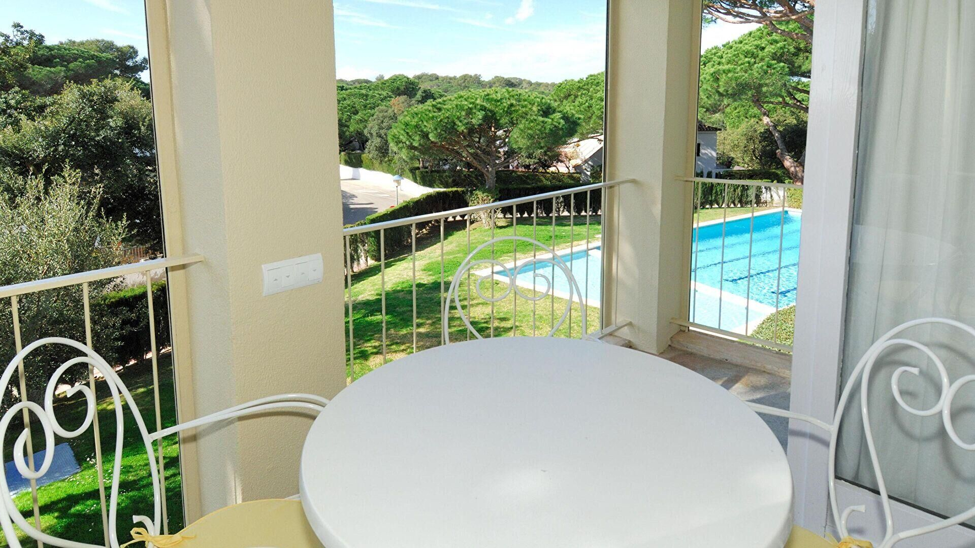 Jardín comunitario, piscina comunitaria y muebles de terraza.