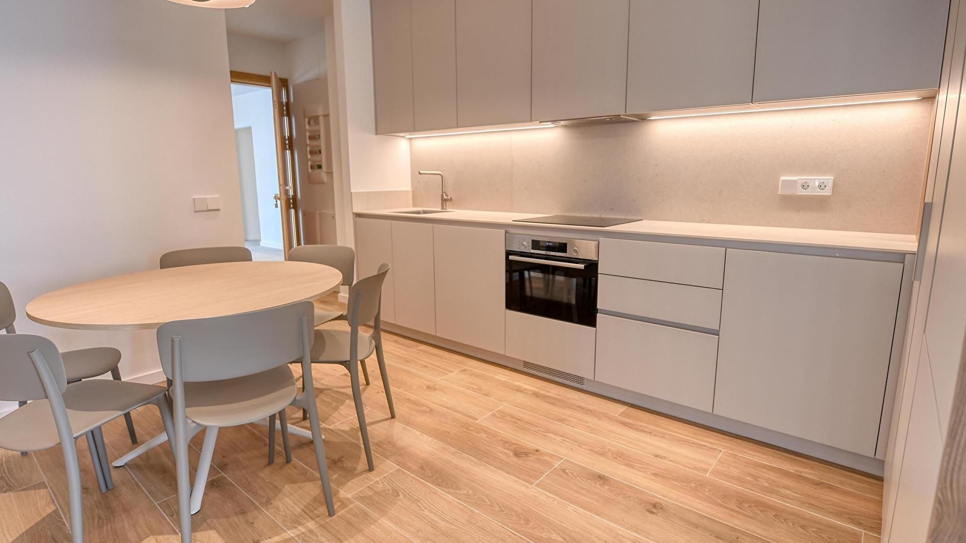 - Cocina americana con placa de inducción, horno, combi, lavaplatos y lavadora.