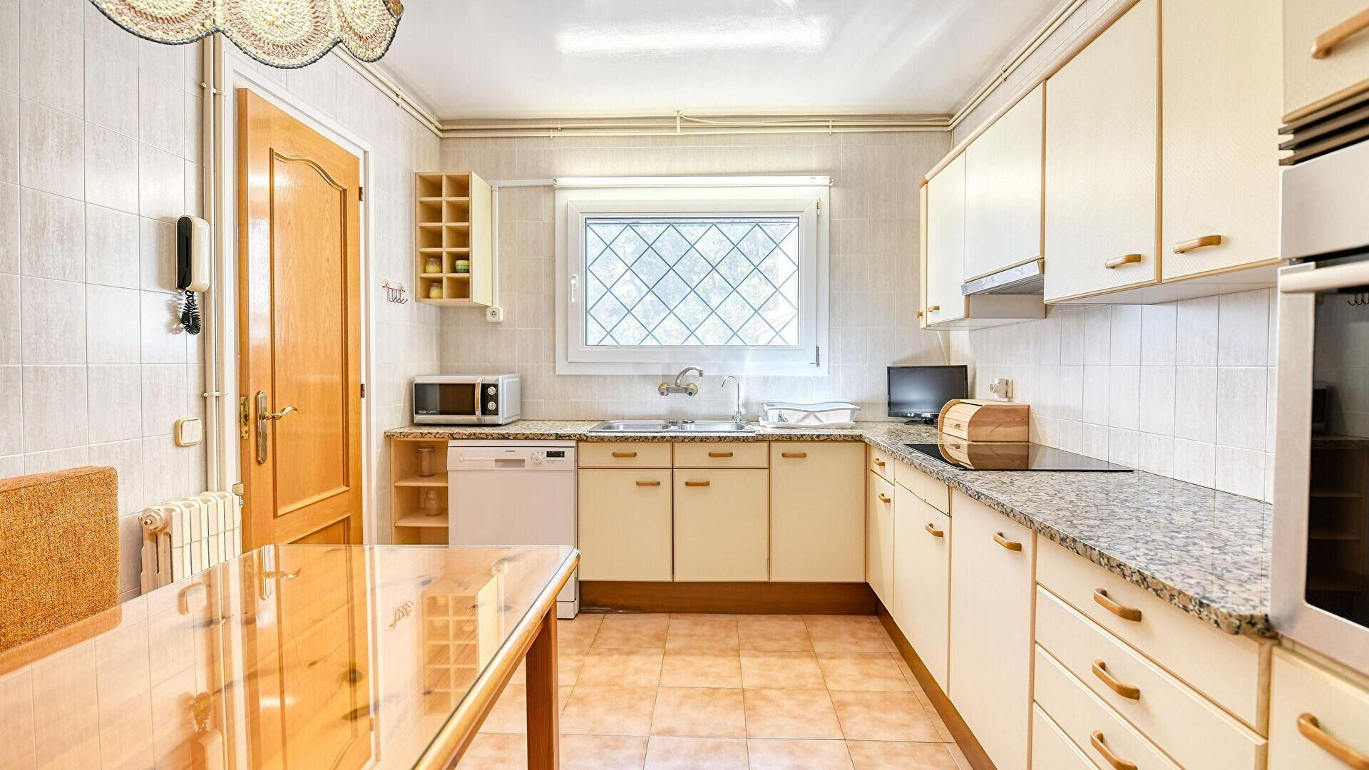 - Cocina office con lavadora, lavaplatos, encimera vitrocerámica, microondas, horno y nevera.