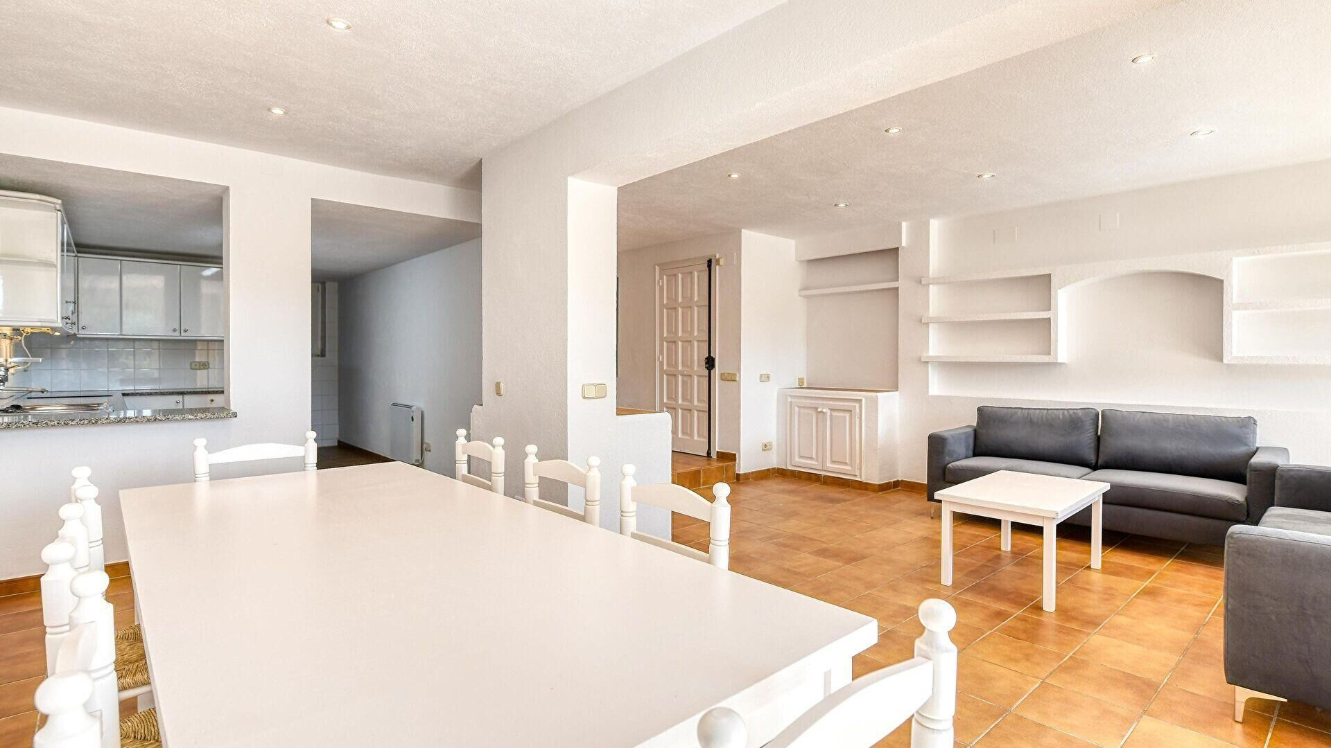 Terraza, comedor-estar, cocina americana, 3 dormitorios, 1 cuarto de baño, 1 baño con ducha y 1 aseo.