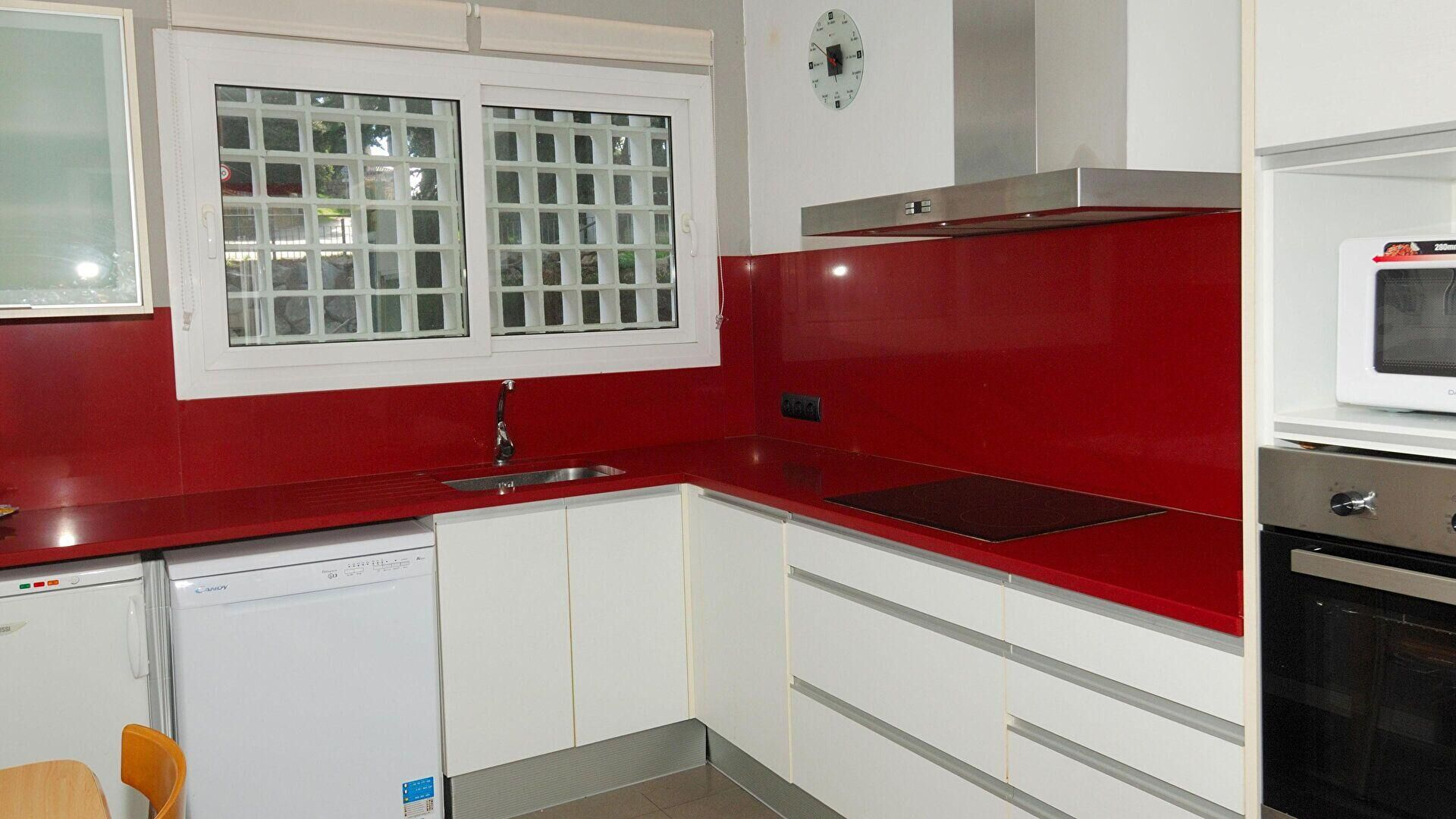 • Cocina con placa de inducción, horno, microondas, combi, lavaplatos y lavadora.