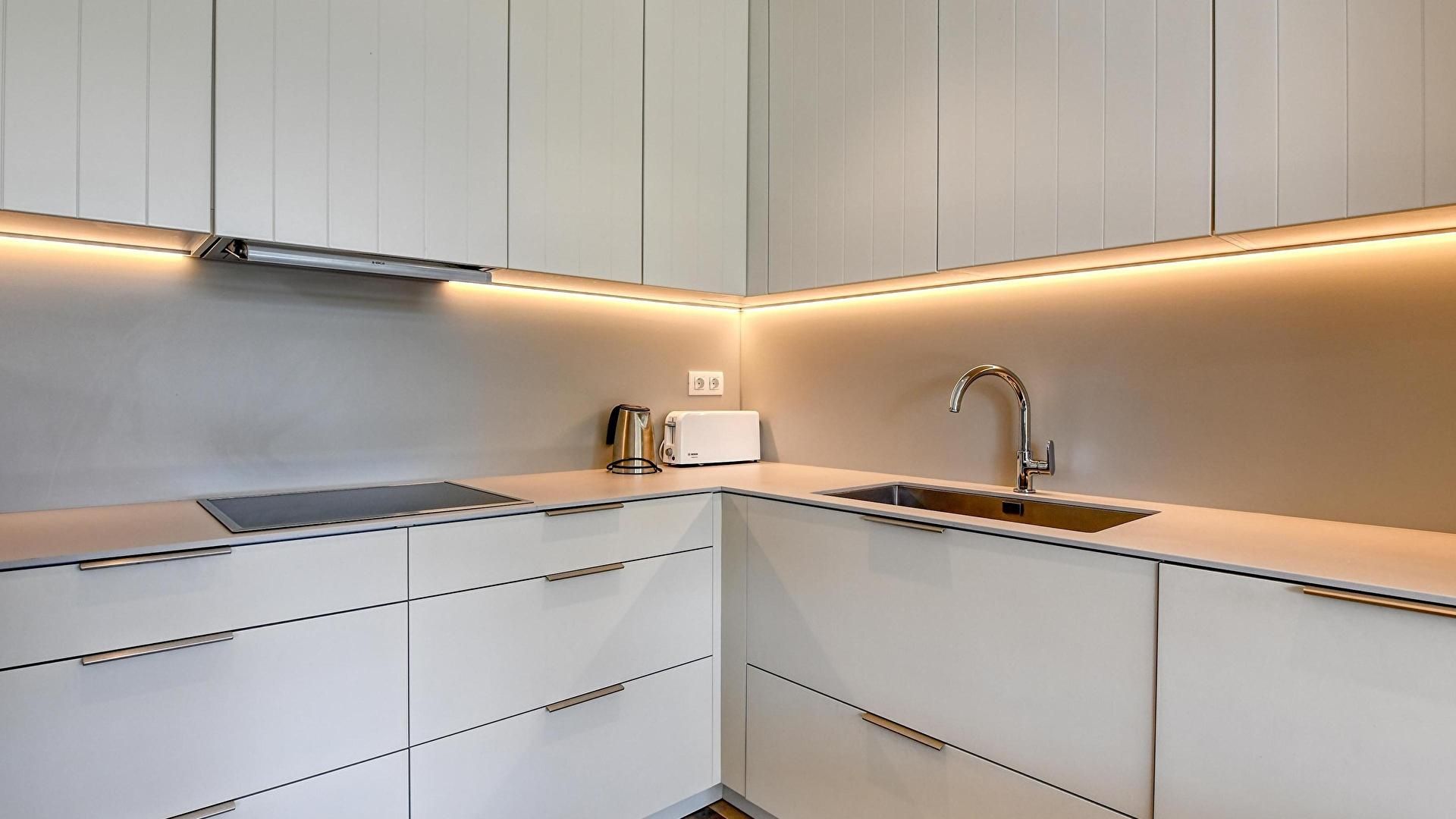 - Cocina americana con placa de inducción, horno, microondas, lavadora, lavaplatos y combi.