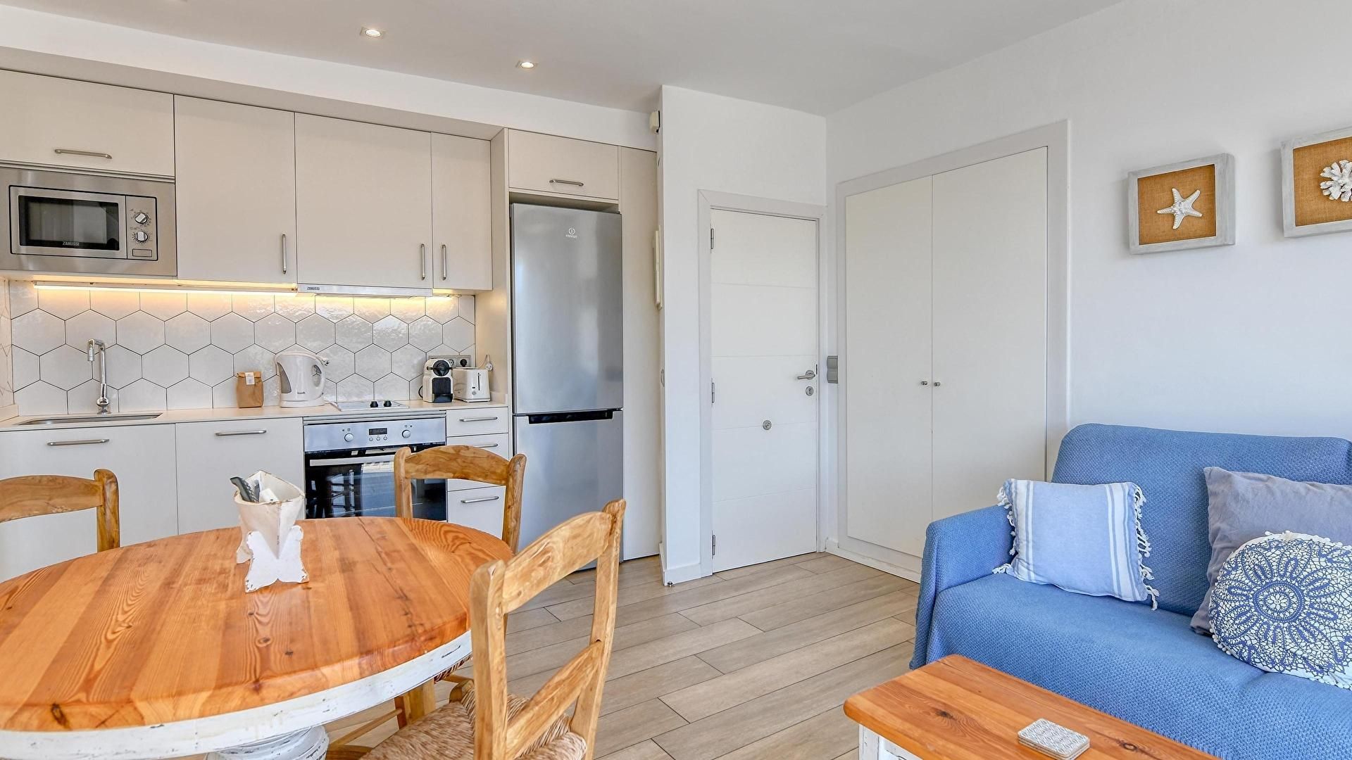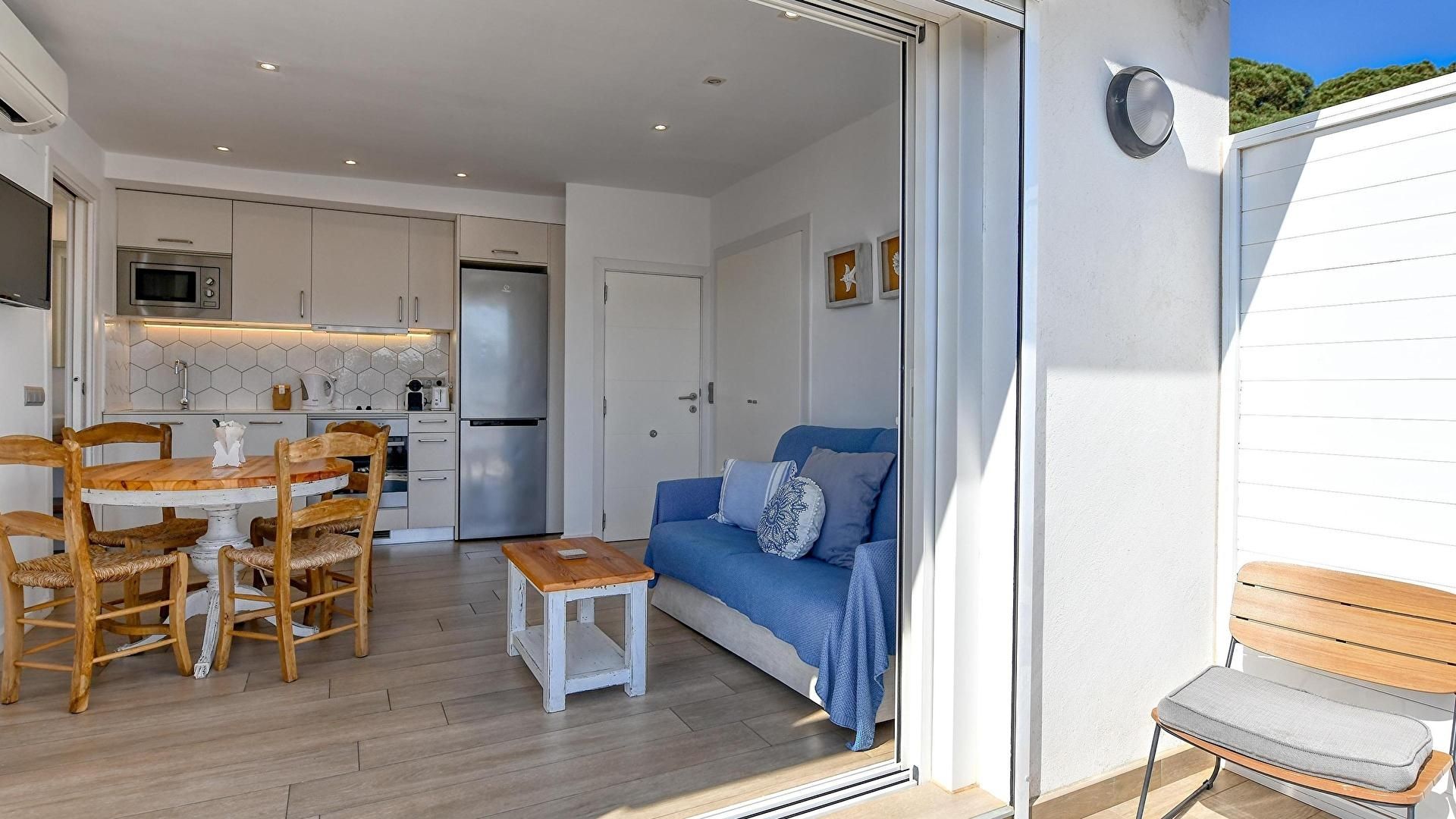 - Comedor-estar con 1 sofá cama de matrimonio, televisor, aire acondicionado frío y caliente, vistas al mar y salida a la terraza.