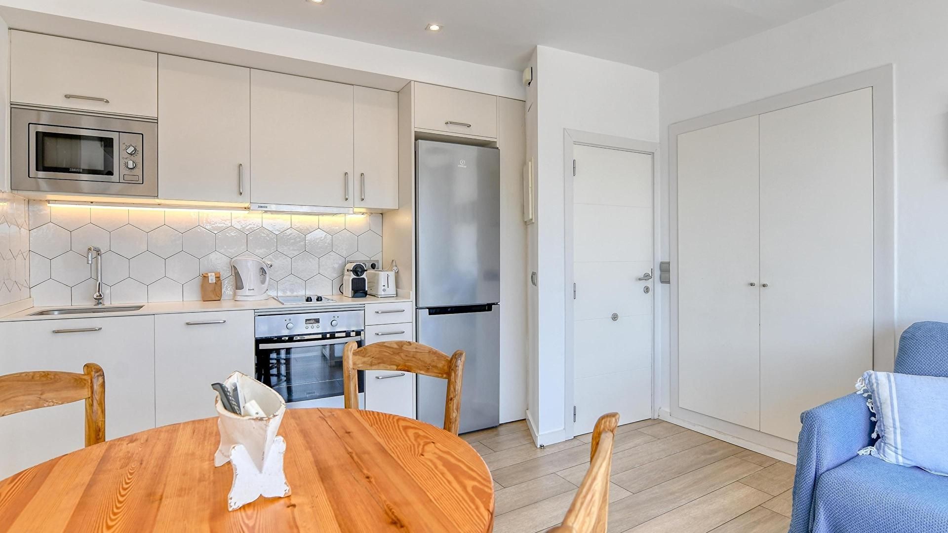 - Cocina americana con microondas, lavaplatos, encimera vitrocerámica y combi.