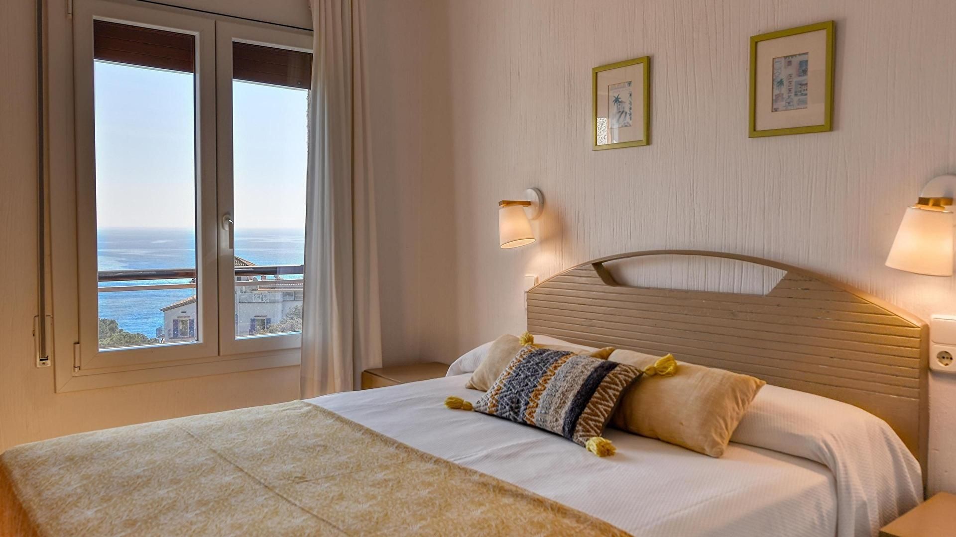 - Dormitorio con 1 cama de matrimonio, salida a la terraza, vistas al mar y radiador eléctrico.
