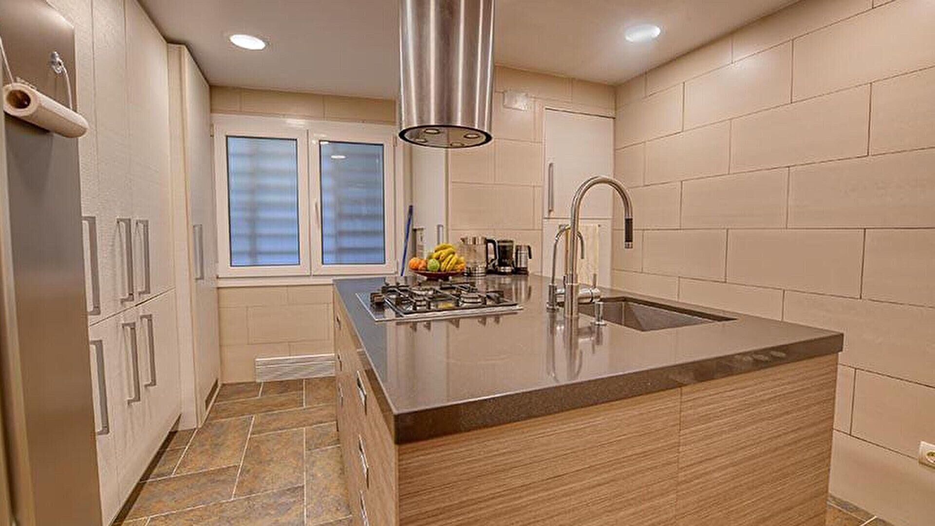 Sala d'estar, cuina, 4 dormitoris, 1 bany amb banyera i 2 banys amb dutxa.
