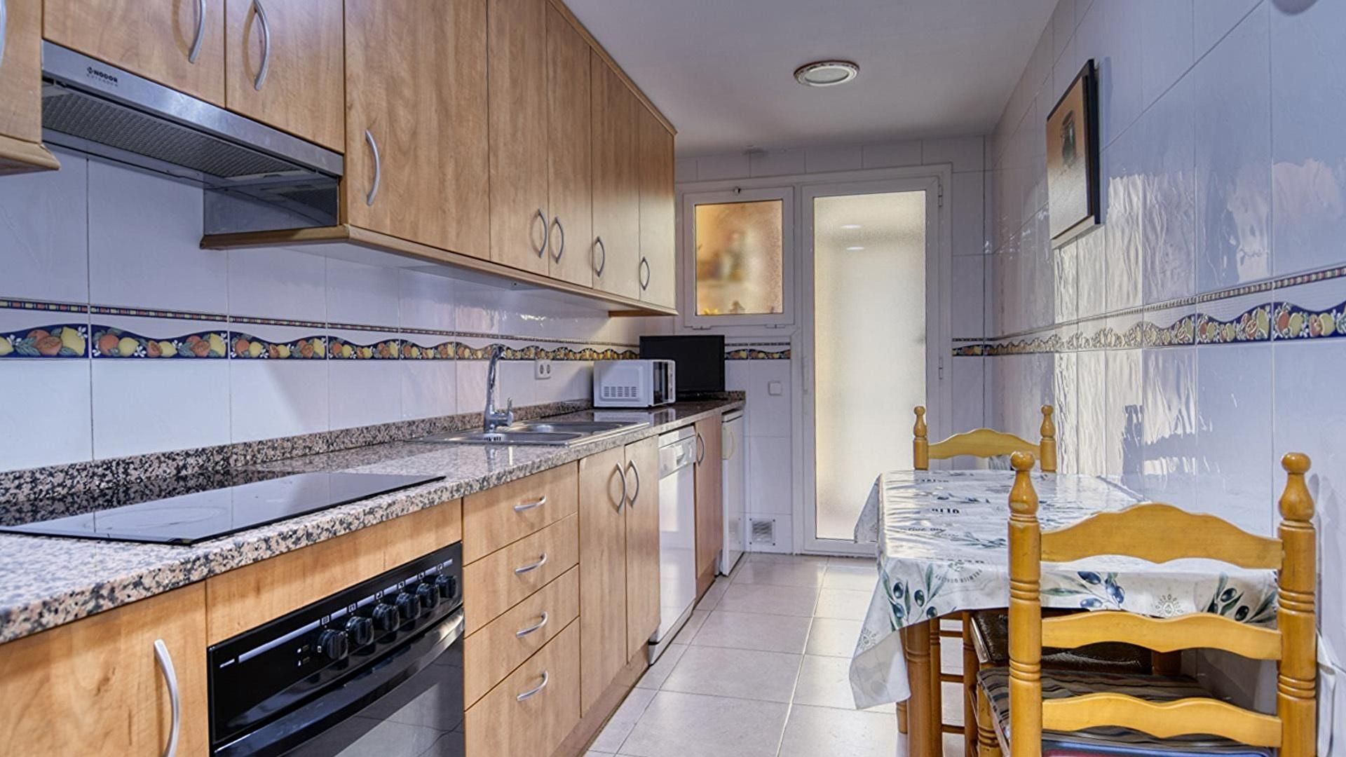 - Cuina office amb placa de cocció vitroceràmica i sortida al balcó.