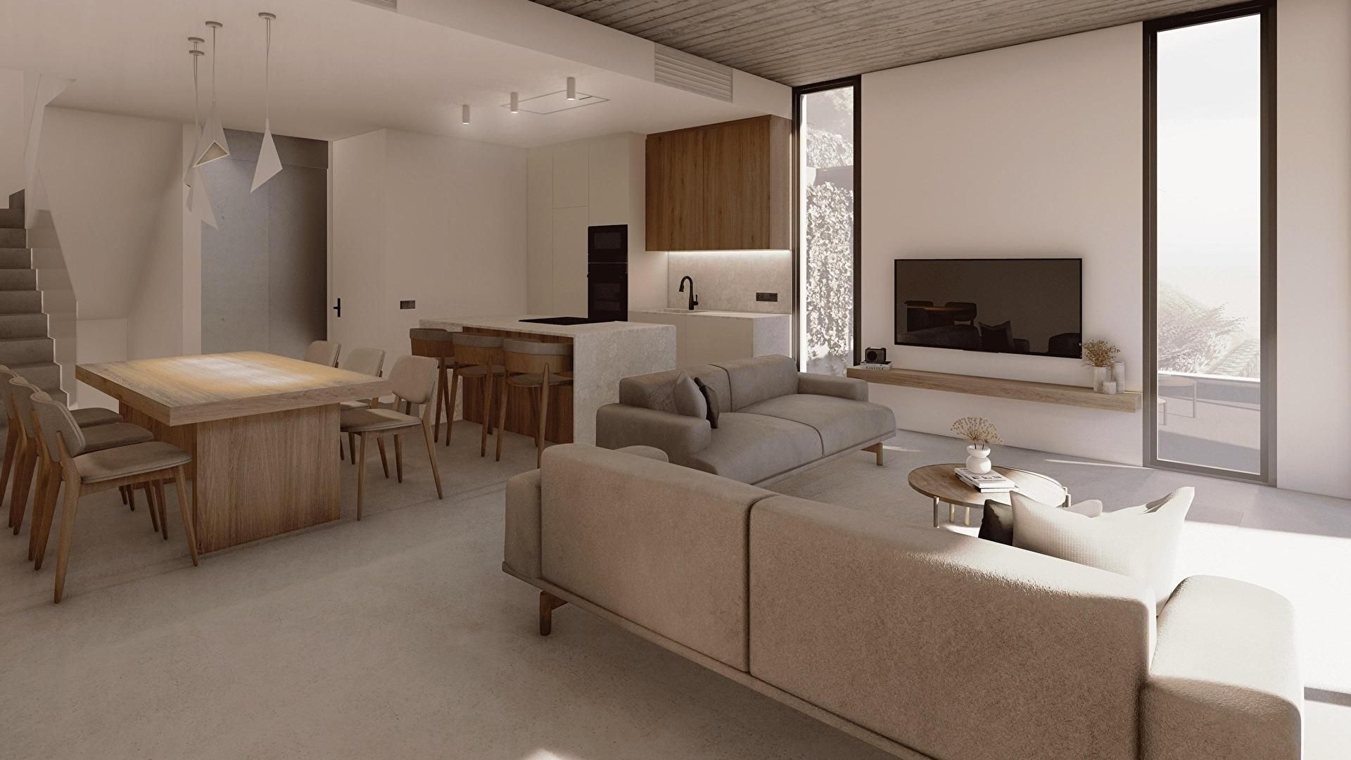Terrasse-Solarium, Wohnzimmer-Esszimmer, offene Küche, 3 Schlafzimmer, 3 Bäder mit Dusche, Abstellraum und Garage.