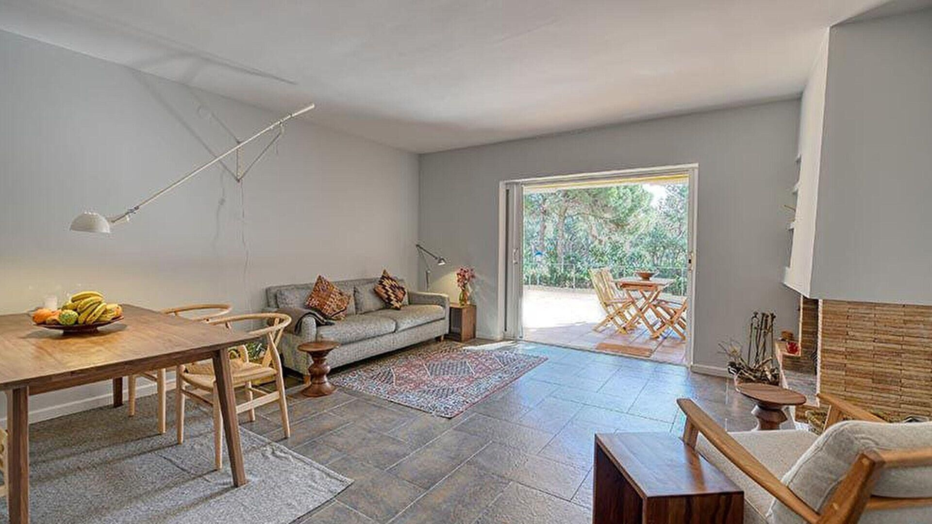 - Wohnzimmer mit ausgang zur terrasse, ausgang zum gemeinschatsgarten, meerblick und kamin.
