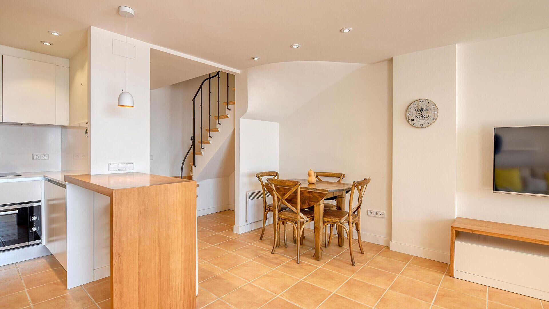 Terrasse, Solarium, Wohnzimmer-Esszimmer, offene Küche, 2 Schlafzimmer und 2 Bäder mit Badewanne.