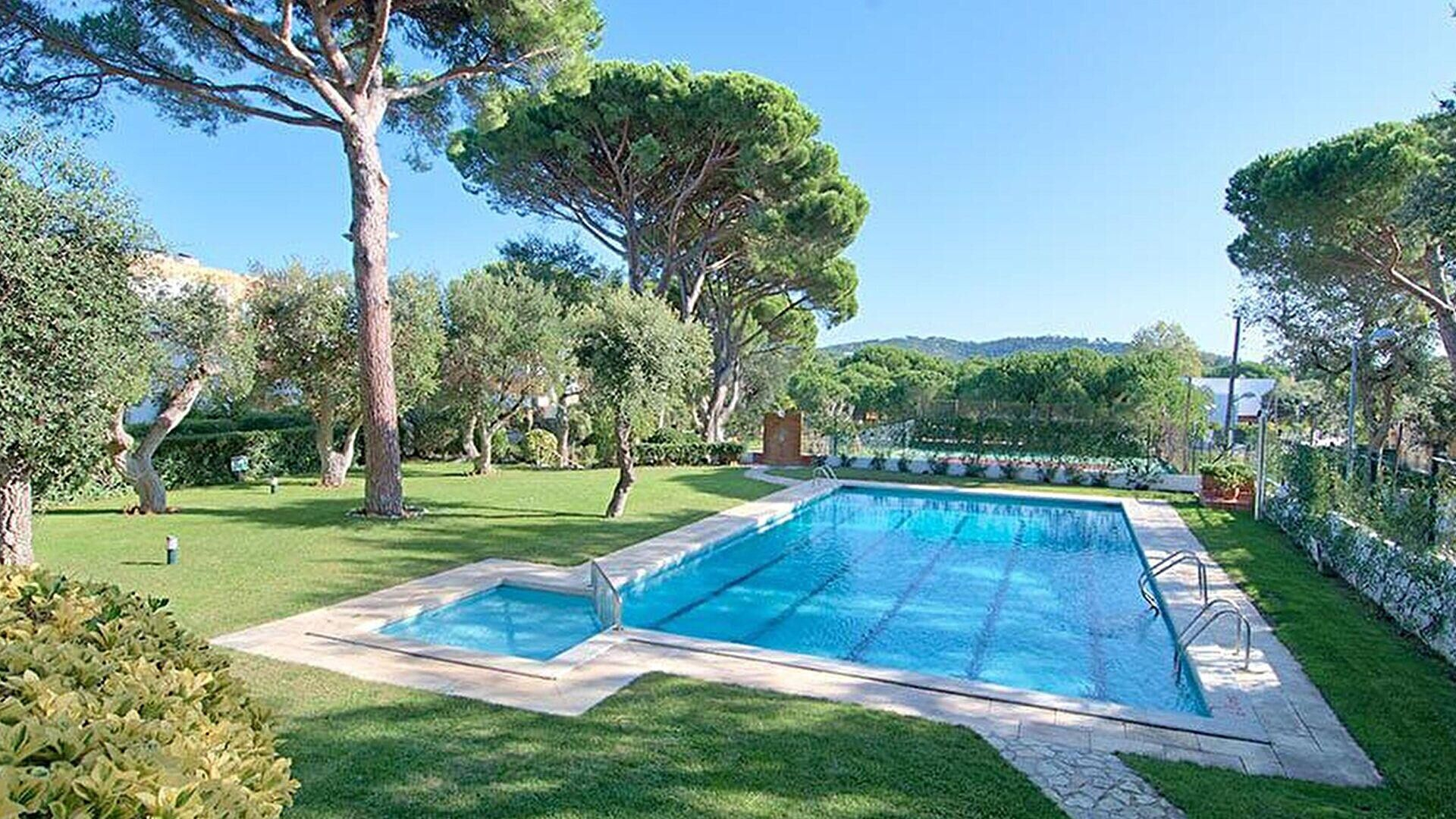 Gartenaussicht und Blick auf den Pool.