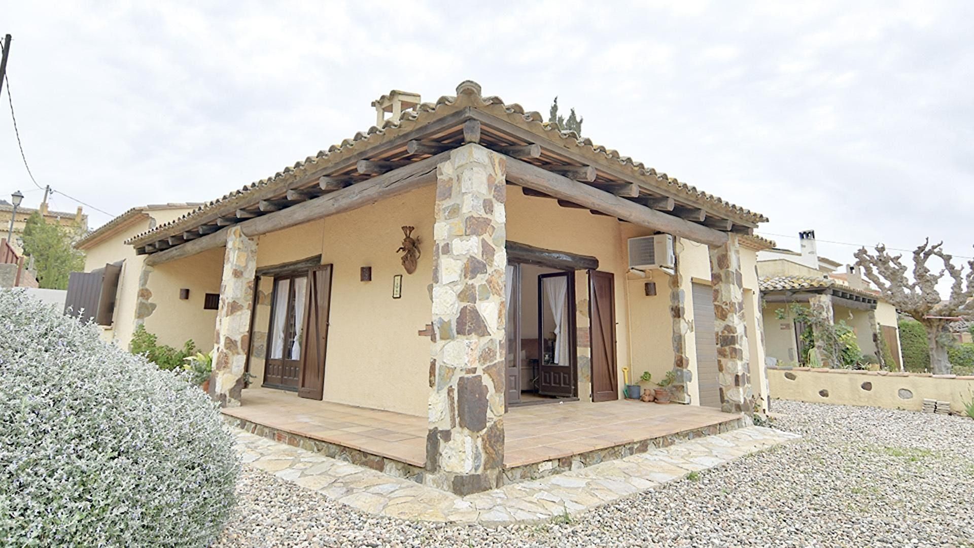 Garten, Veranda, Wohnzimmer-Esszimmer, Küche-Office, 3 Schlafzimmer, 1 Bad mit Dusche und Garage.