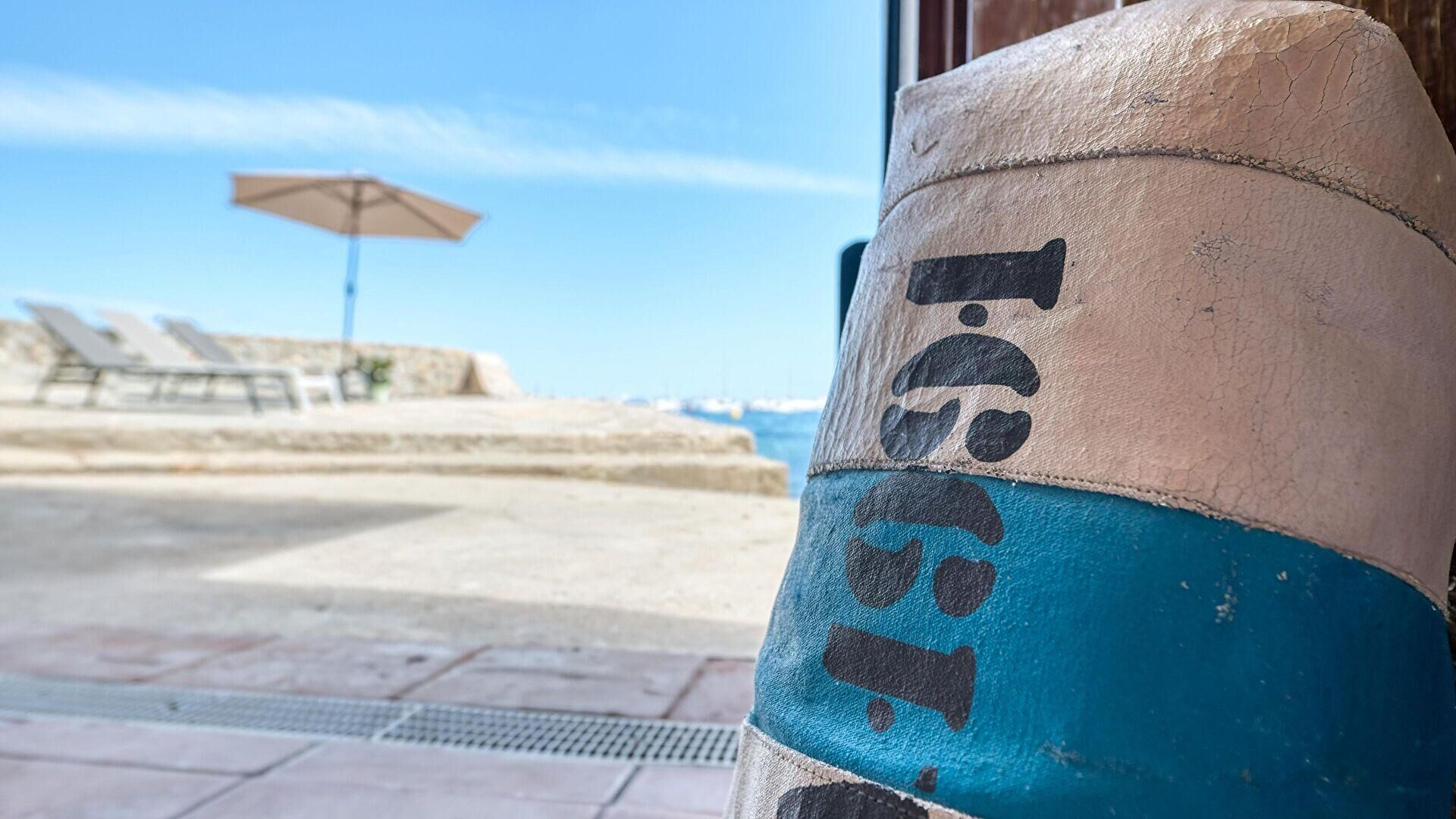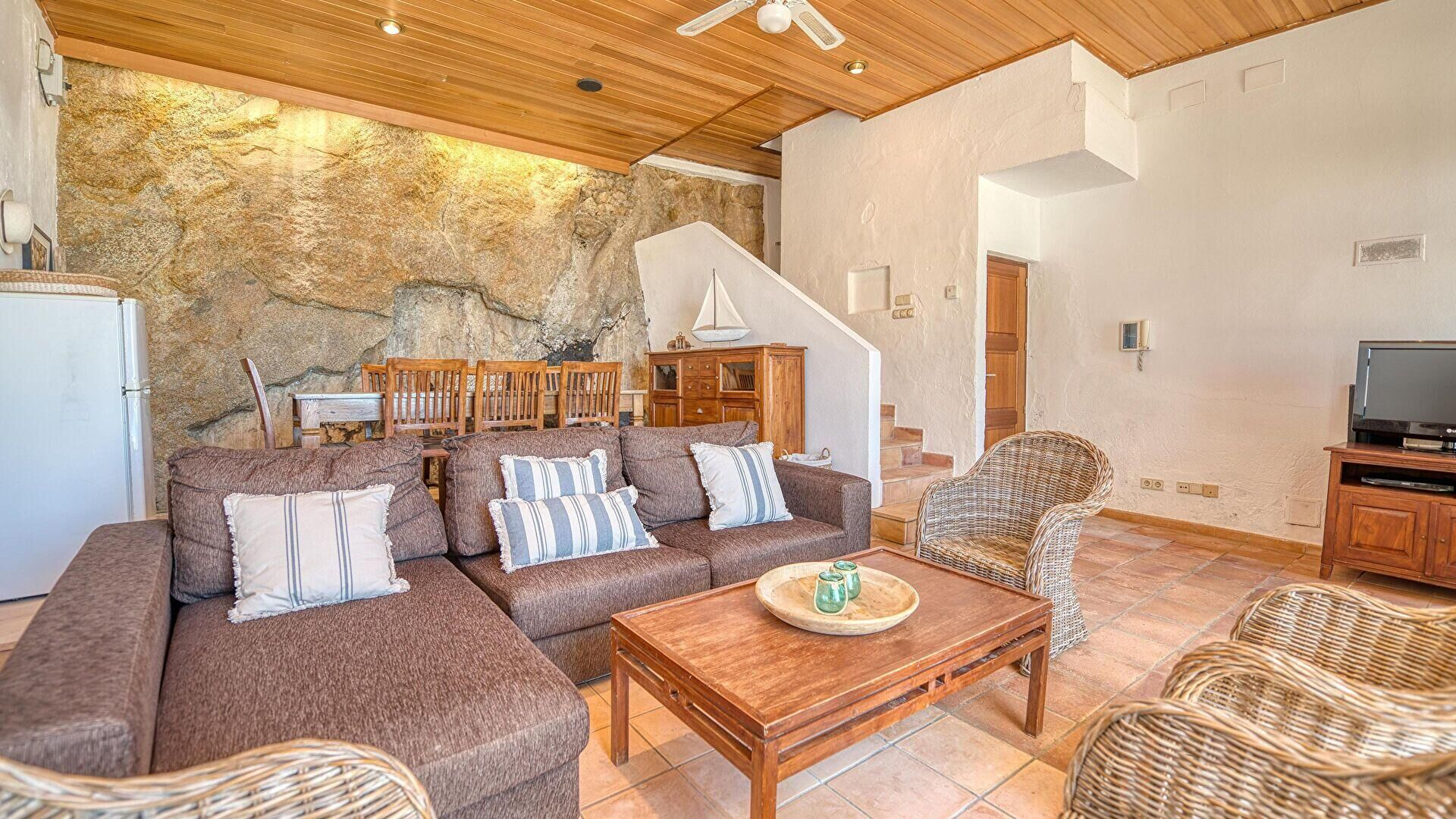 Planta baixa- Menjador-estar, vistes al mar, televisor, ventilador en el sostre i sortida al mar.