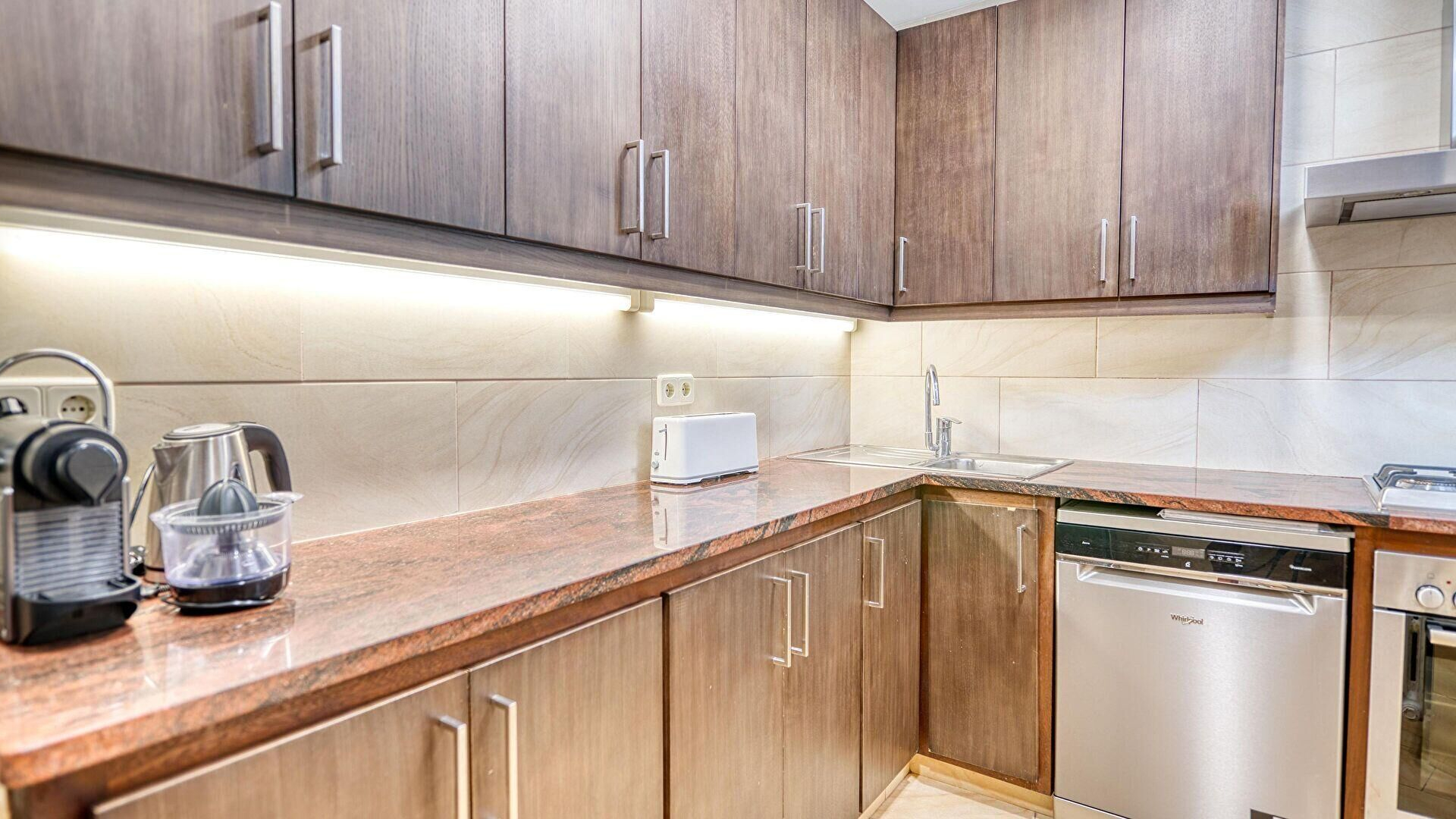 Planta 1- Cuina amb placa de cocció a gas, forn, microones, nevera, rentaplats i rentadora.