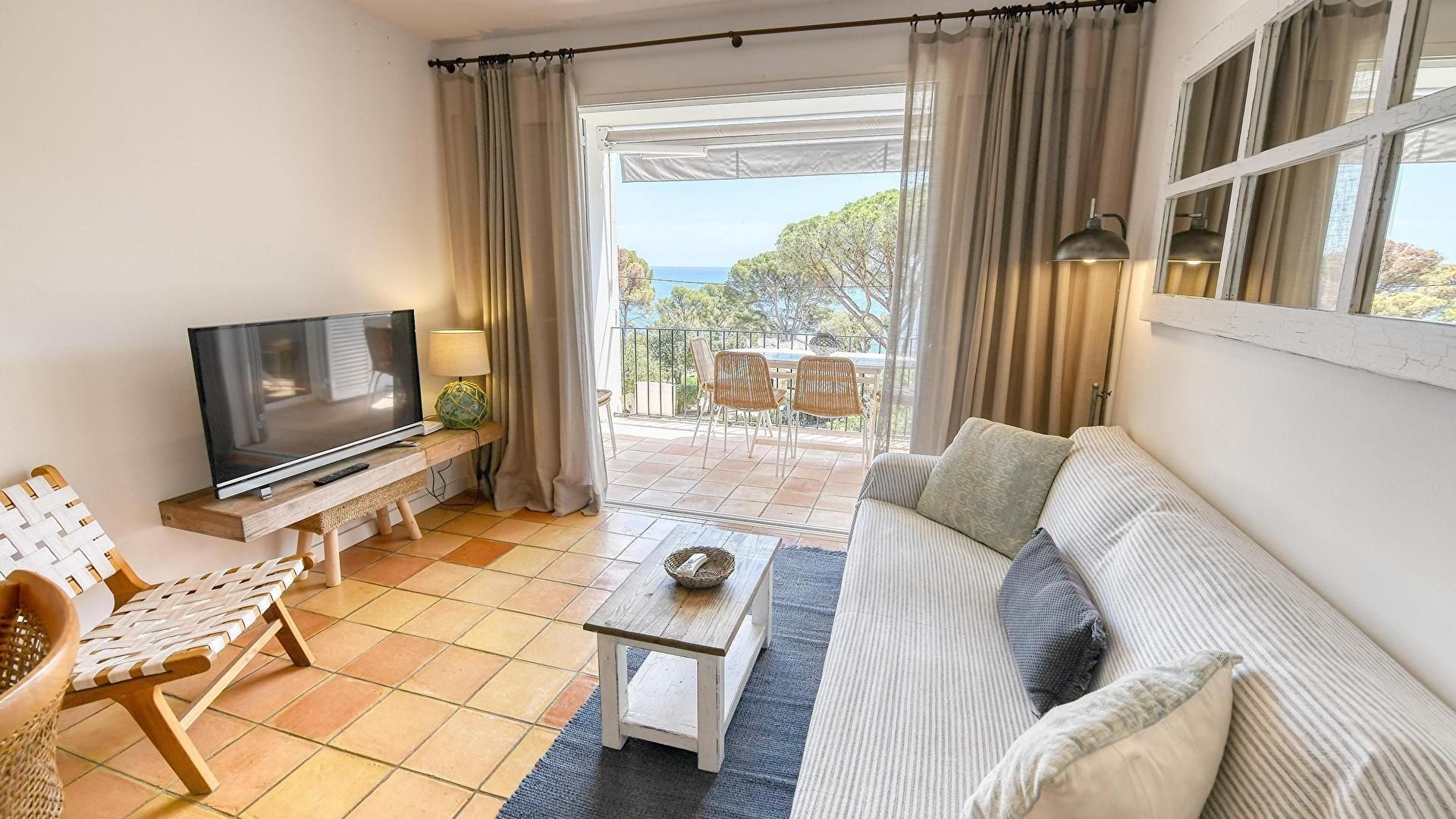 - Sala d'estar amb televisor, sortida a la terrassa, ventilador en el sostre, radiador elèctric i vistes al mar.