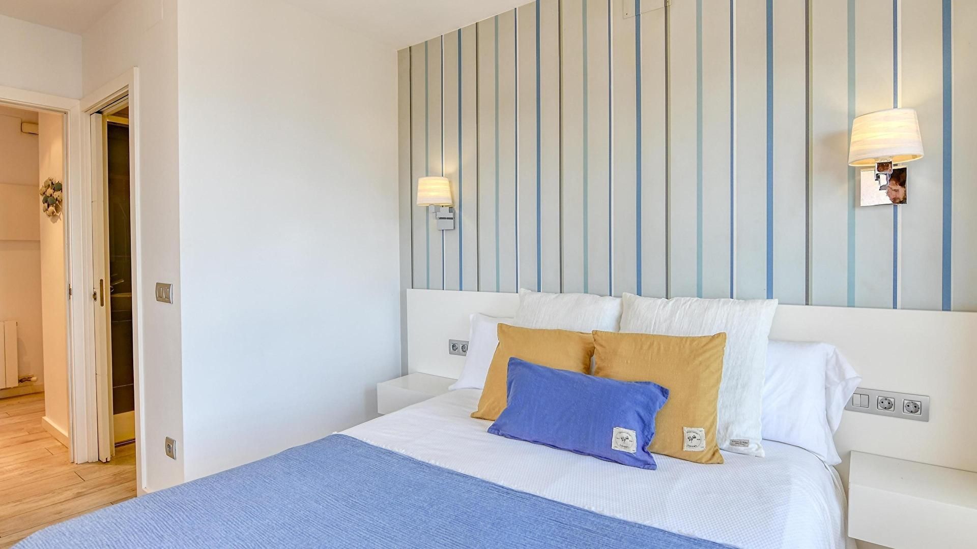 - Dormitori amb 1 llit de matrimoni, sortida a la terrassa, vistes al mar i bany amb dutxa (en suite).