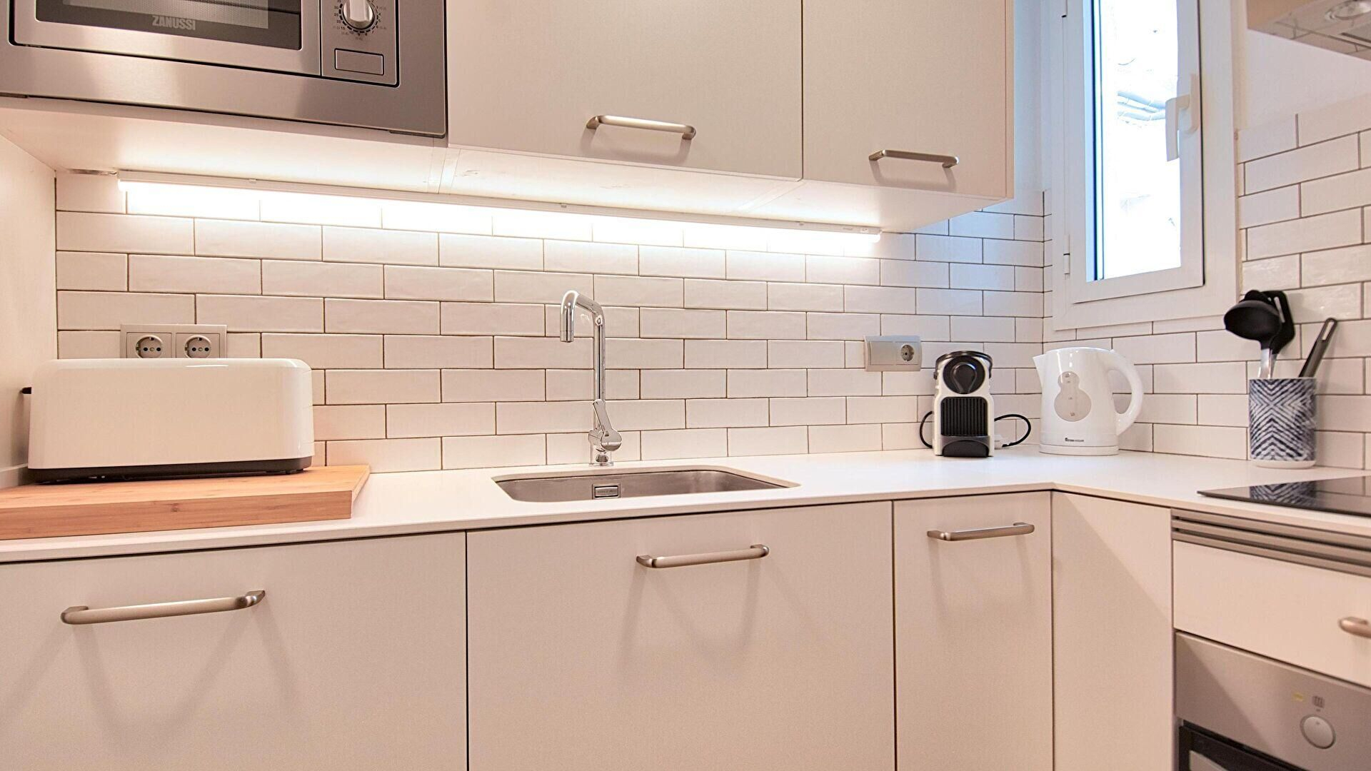 Rentadora, planxa, cafetera, cafetera de cà psules, torradora, aire condicionat al menjador i 2 persianes automà tiques.