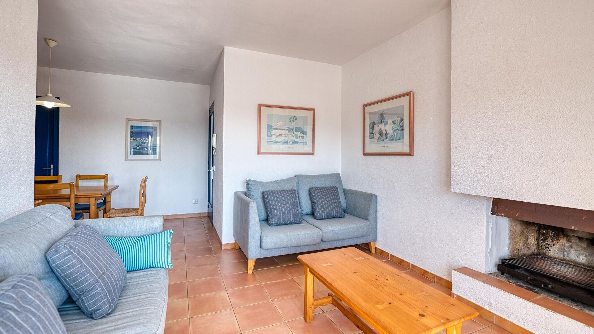 - Salle de séjour, cheminée, téléviseur et sortie sur la terrasse.
