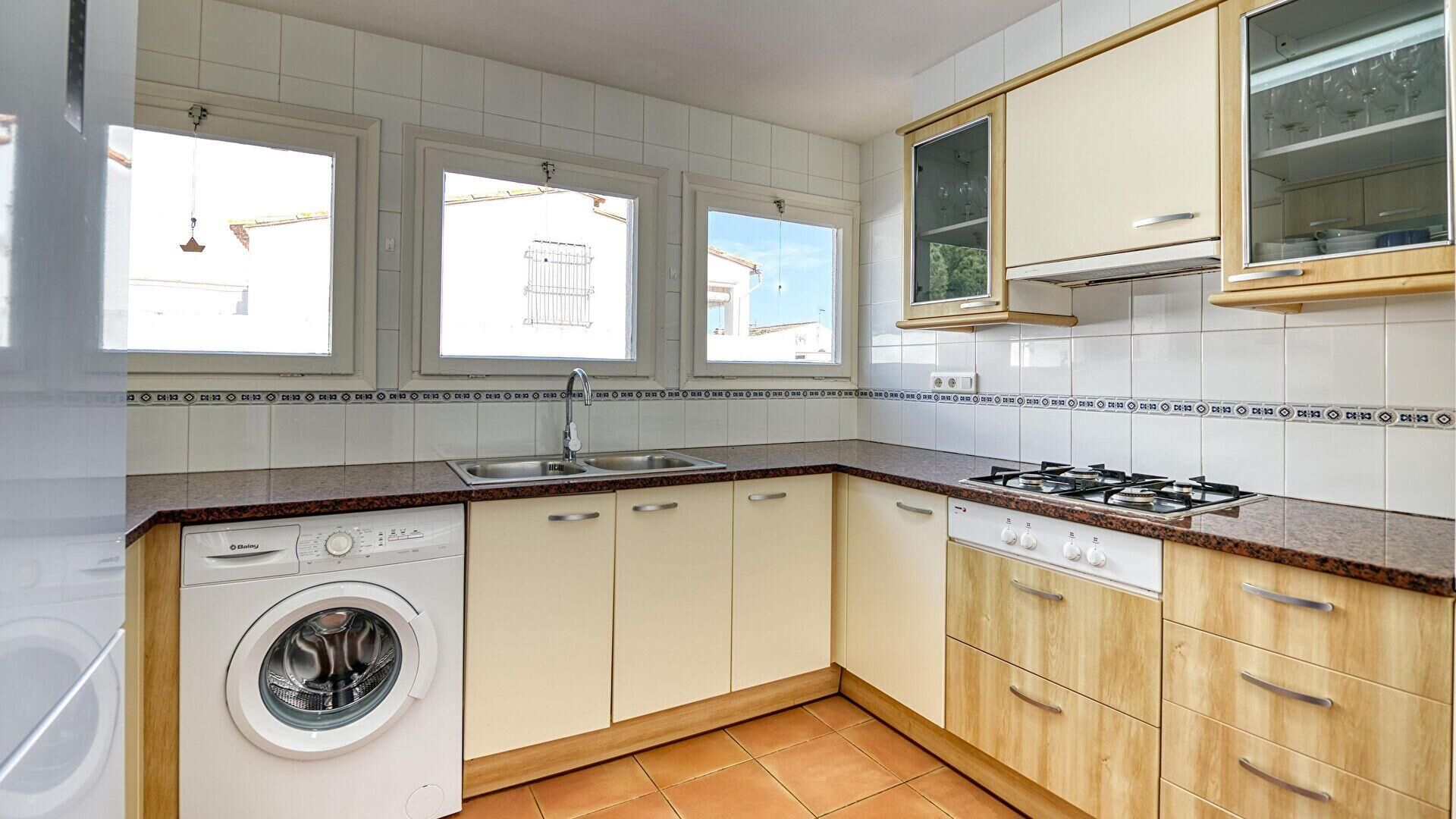 - Cuisine avec plaque de cuisson électrique, four, réfrigérateur et machine à laver.