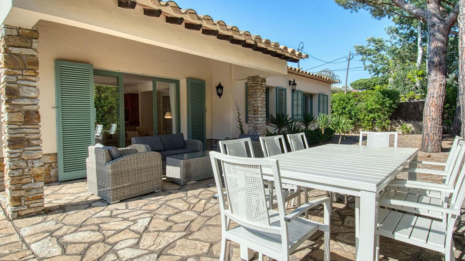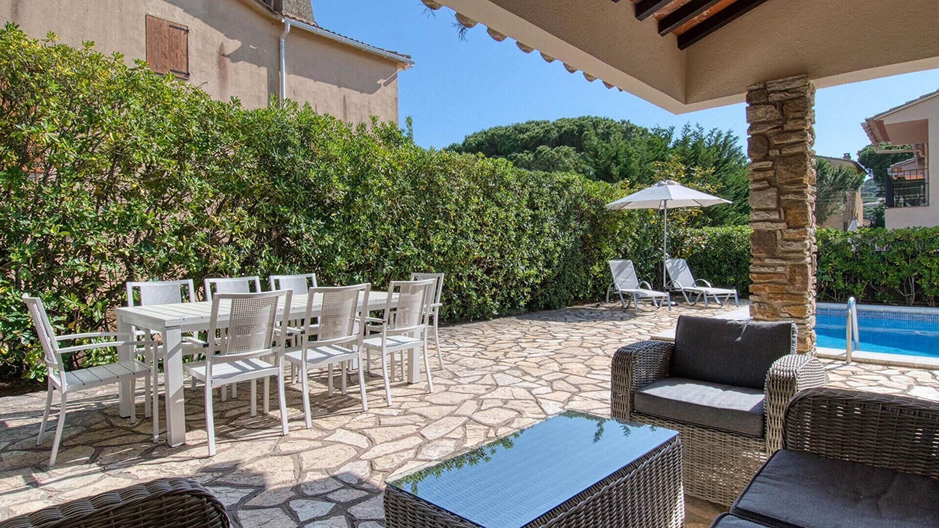 Piscine privée et meubles de terrasse.