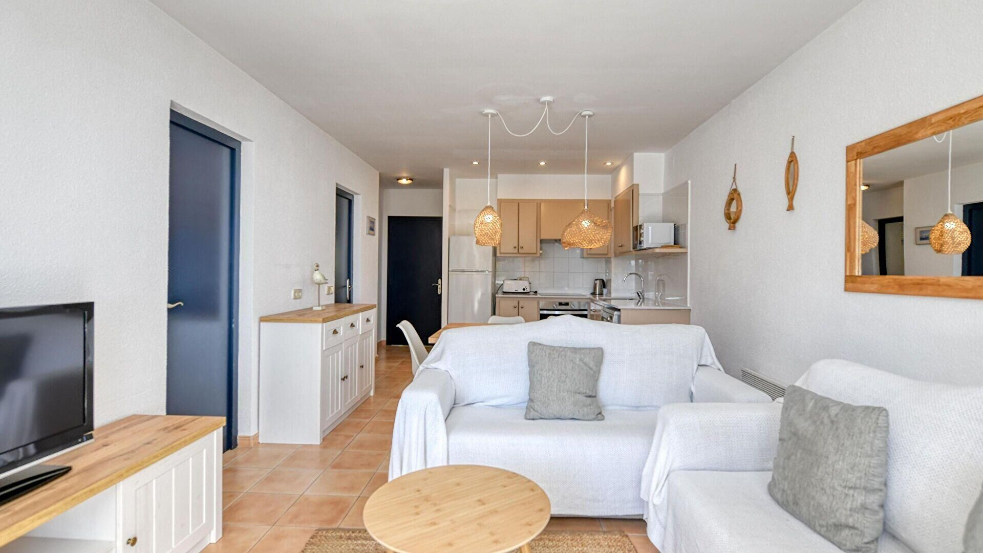 - Salle de séjour, téléviseur et sortie sur la terrasse.