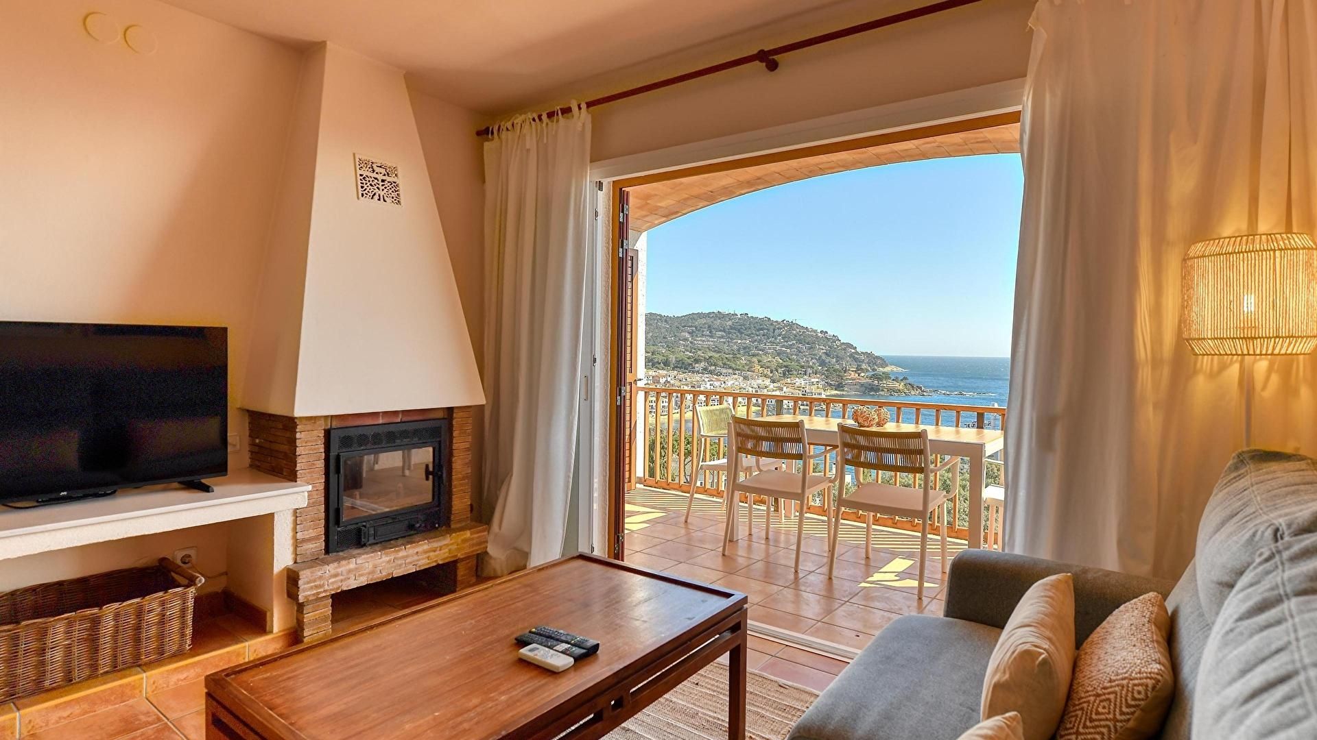 - Salle de séjour avec 1 canapé-lit double, cheminée, téléviseur, air conditionnée froid/chaud avec thermostat indépendant et sortie sur la terrasse.