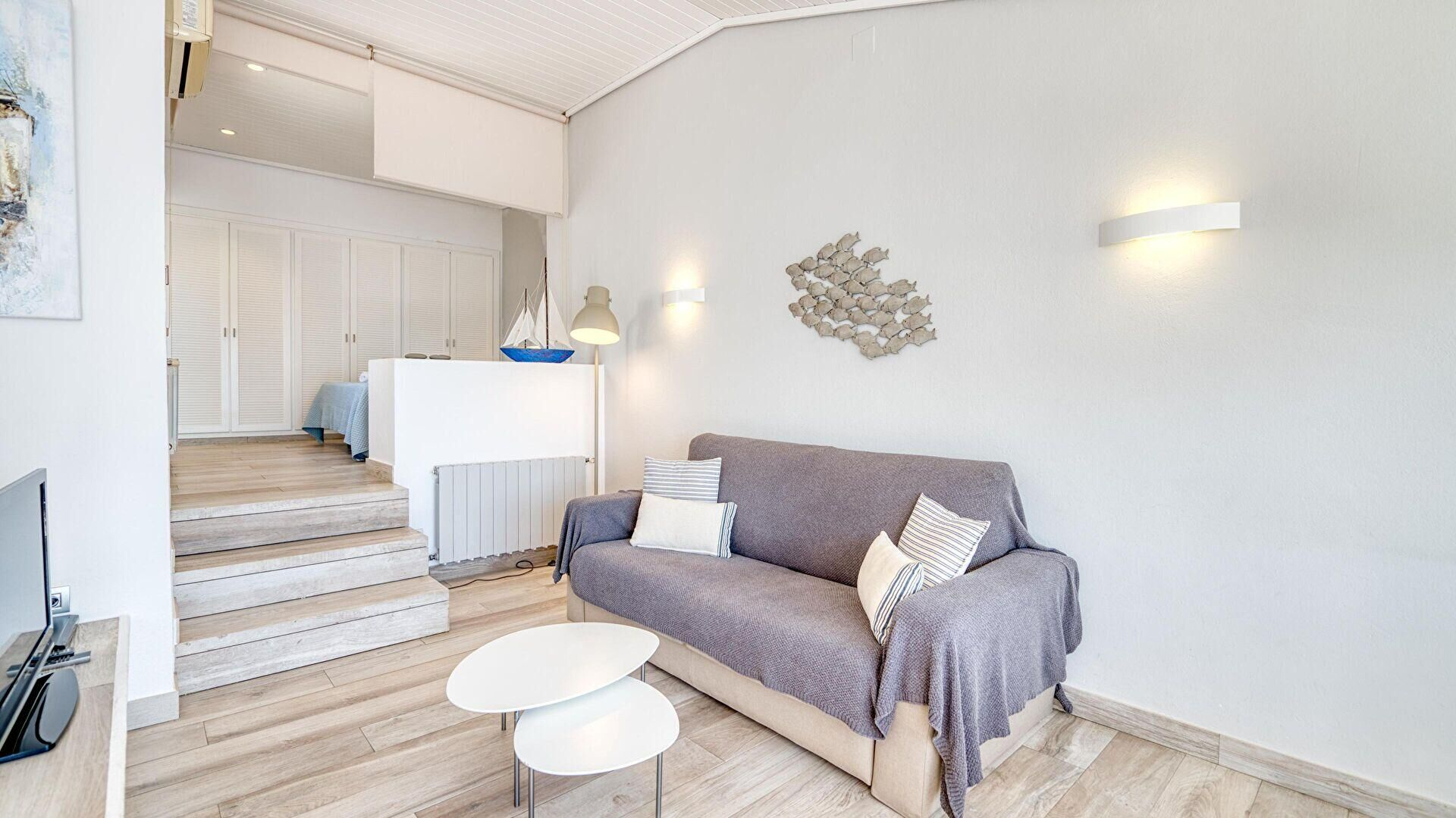 - Salle de séjour avec 1 canapé-lit pour 2 personnes, téléviseur, vue sur la mer, sortie sur la terrasse et air conditionnée froid/chaud.