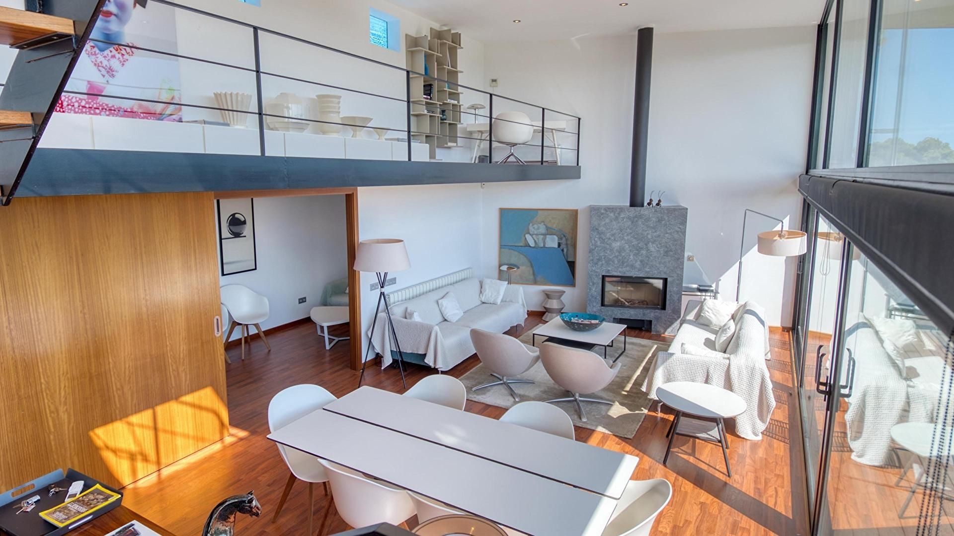 Étage 1- Salle de séjour avec terrasse, cheminée, sortie sur la terrasse, air conditionnée froid/chaud et vue sur la mer.