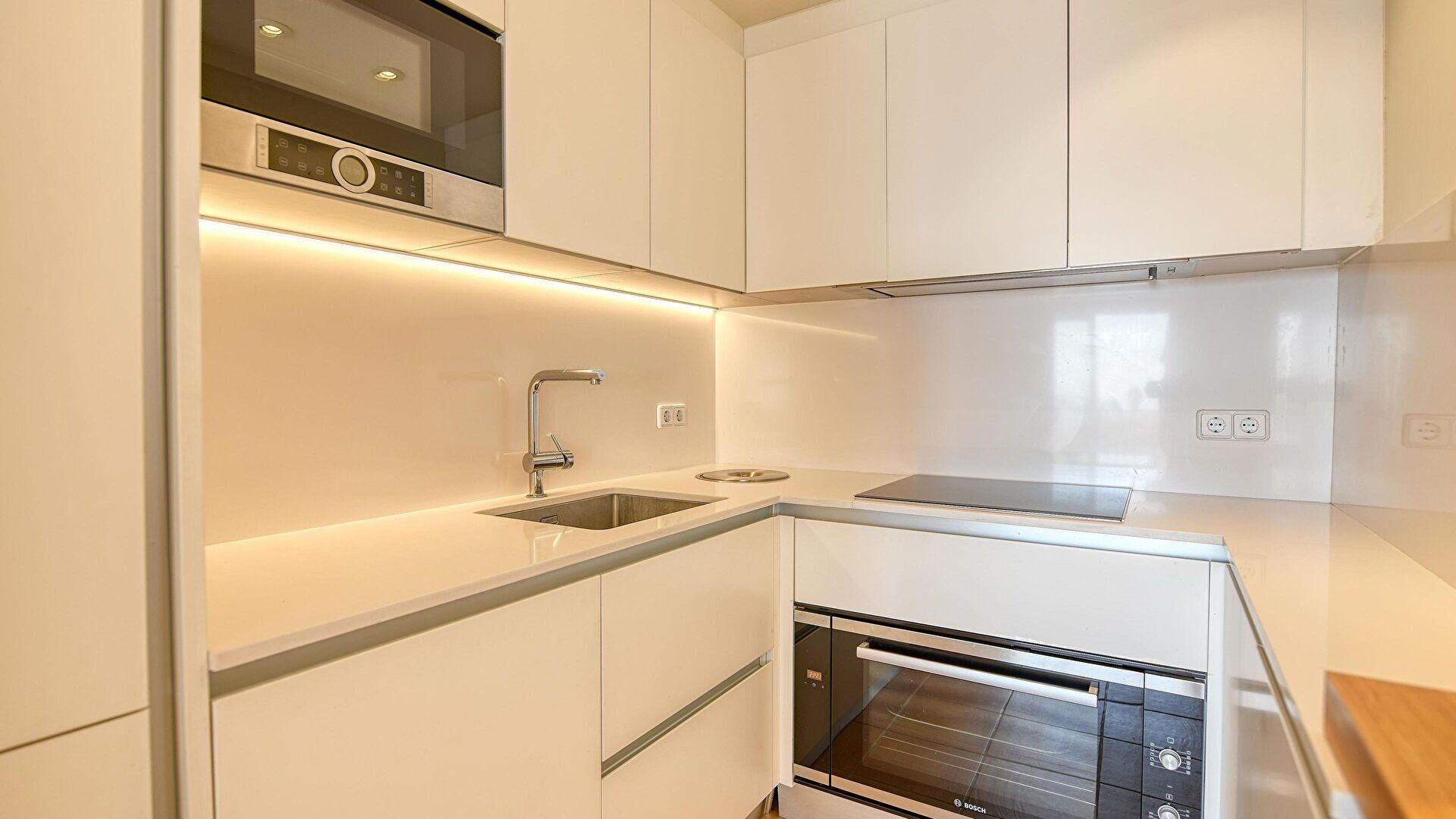 Open american style kitchen with sun deck, gas hobb, oven, fridge and washing machine.