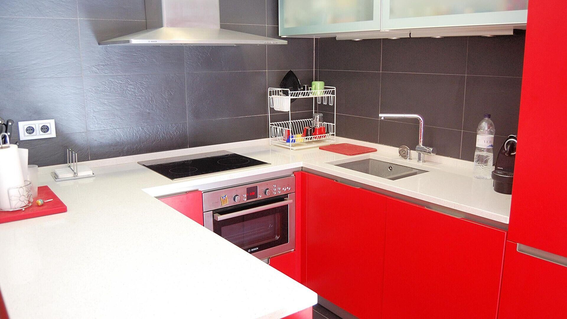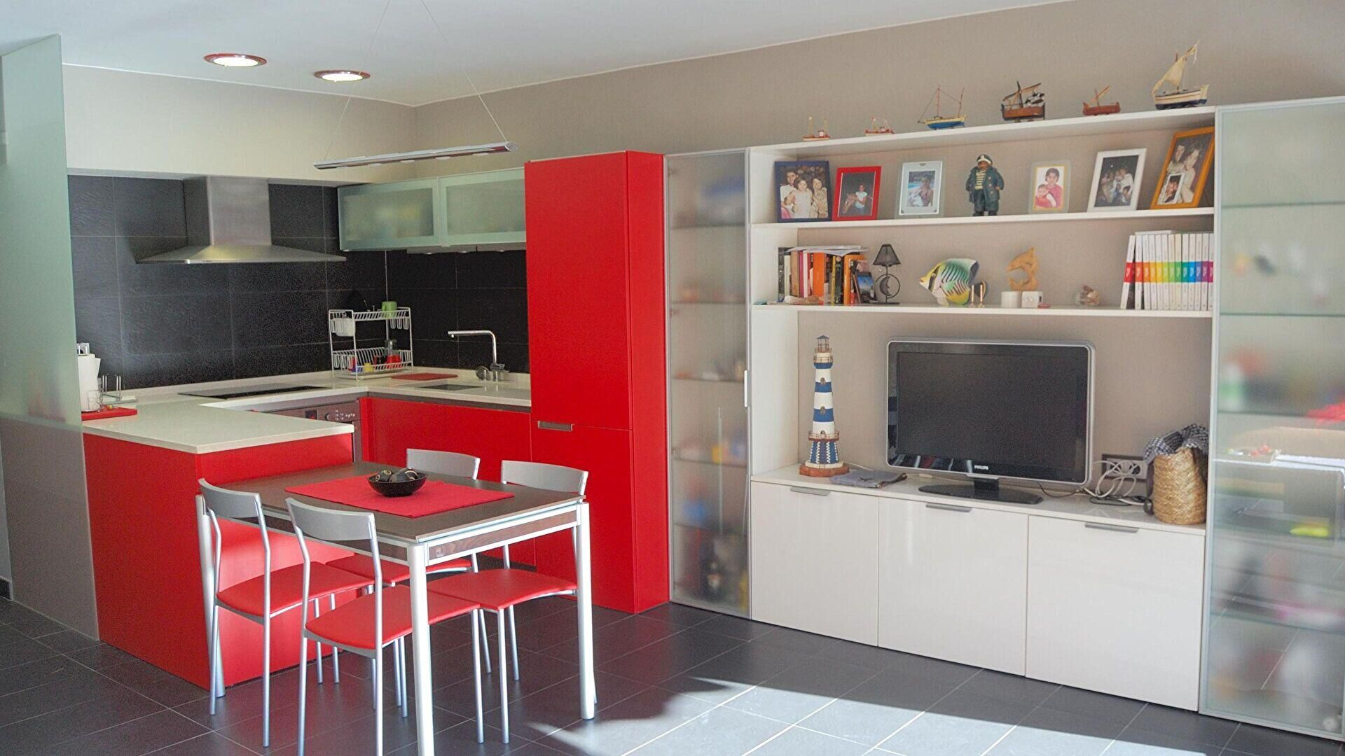 - Open american style kitchen with ceramic hobb, oven, fridge and washing machine.