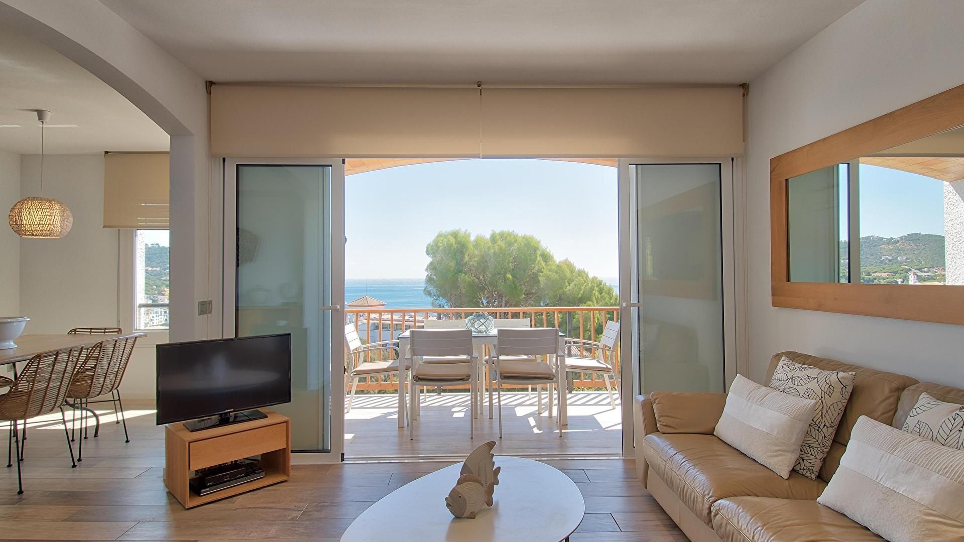 - Dining room, television, access to the terrace, sea view and air conditionning and heating unit.
